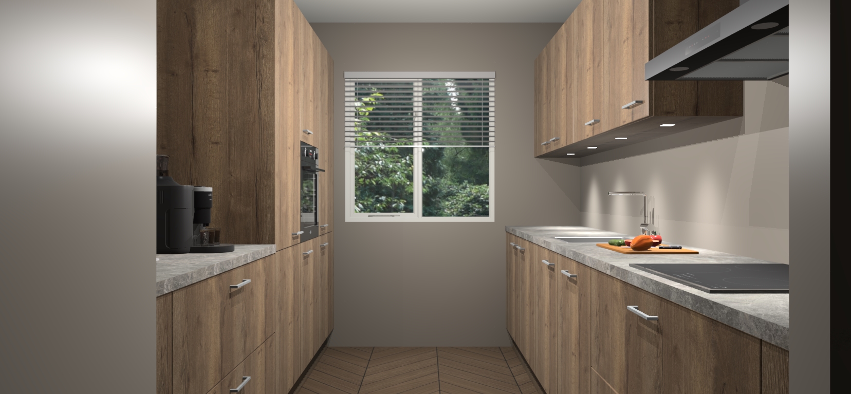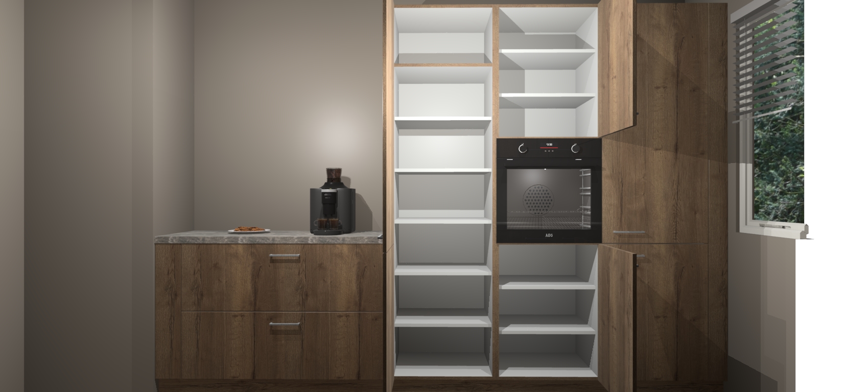 Een stijlvolle en praktische keuken als deze mag gezien worden. Dankzij de prachtige Chocolade Eiken matte afwerking wordt de keuken gemakkelijk het middelpunt van uw huis - hij ziet er geweldig uit onder allerlei lichtomstandigheden, van dag tot nacht!