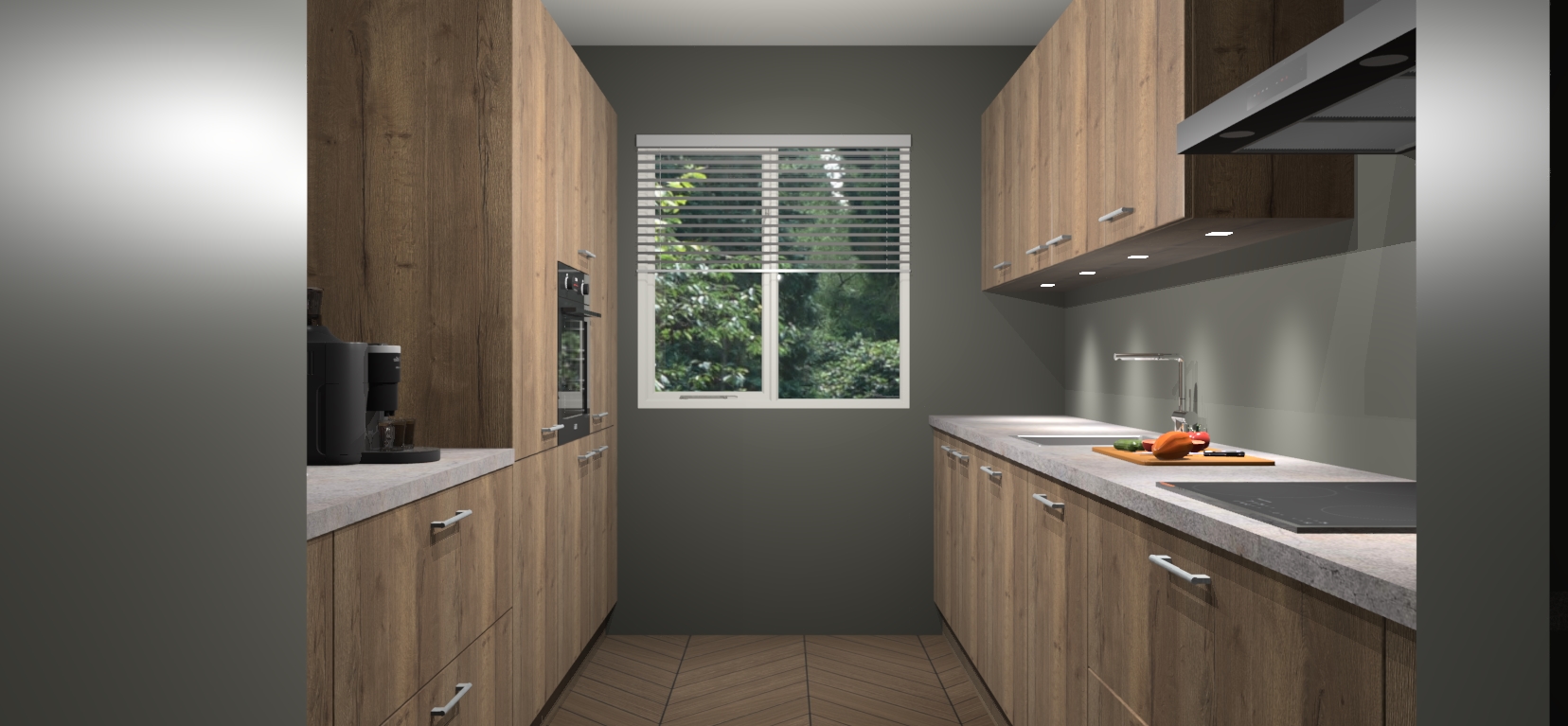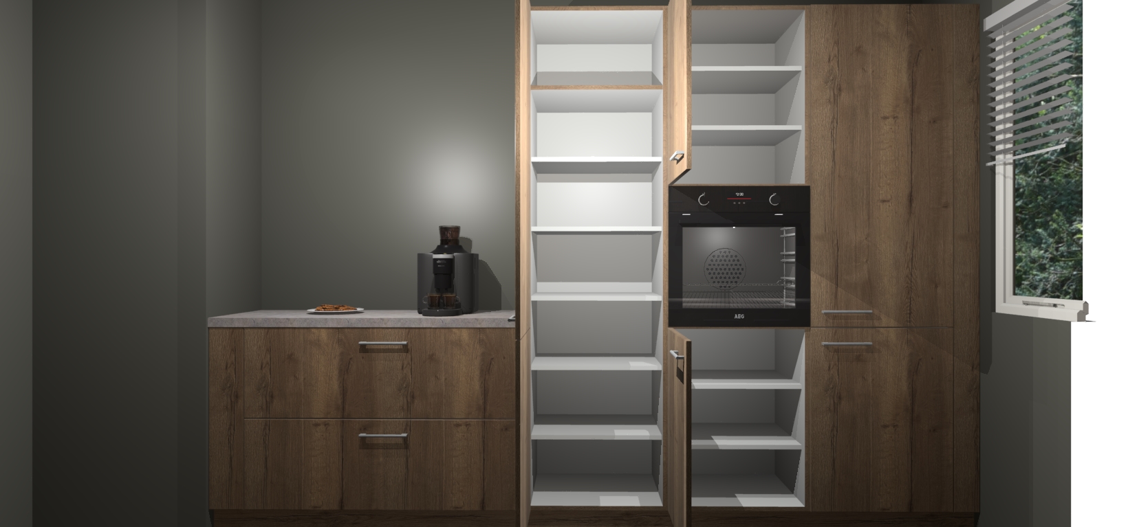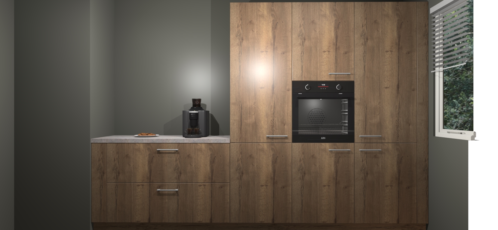 Een stijlvolle en praktische keuken als deze mag gezien worden. Dankzij de prachtige Chocolade Eiken matte afwerking wordt de keuken gemakkelijk het middelpunt van uw huis - hij ziet er geweldig uit onder allerlei lichtomstandigheden, van dag tot nacht!