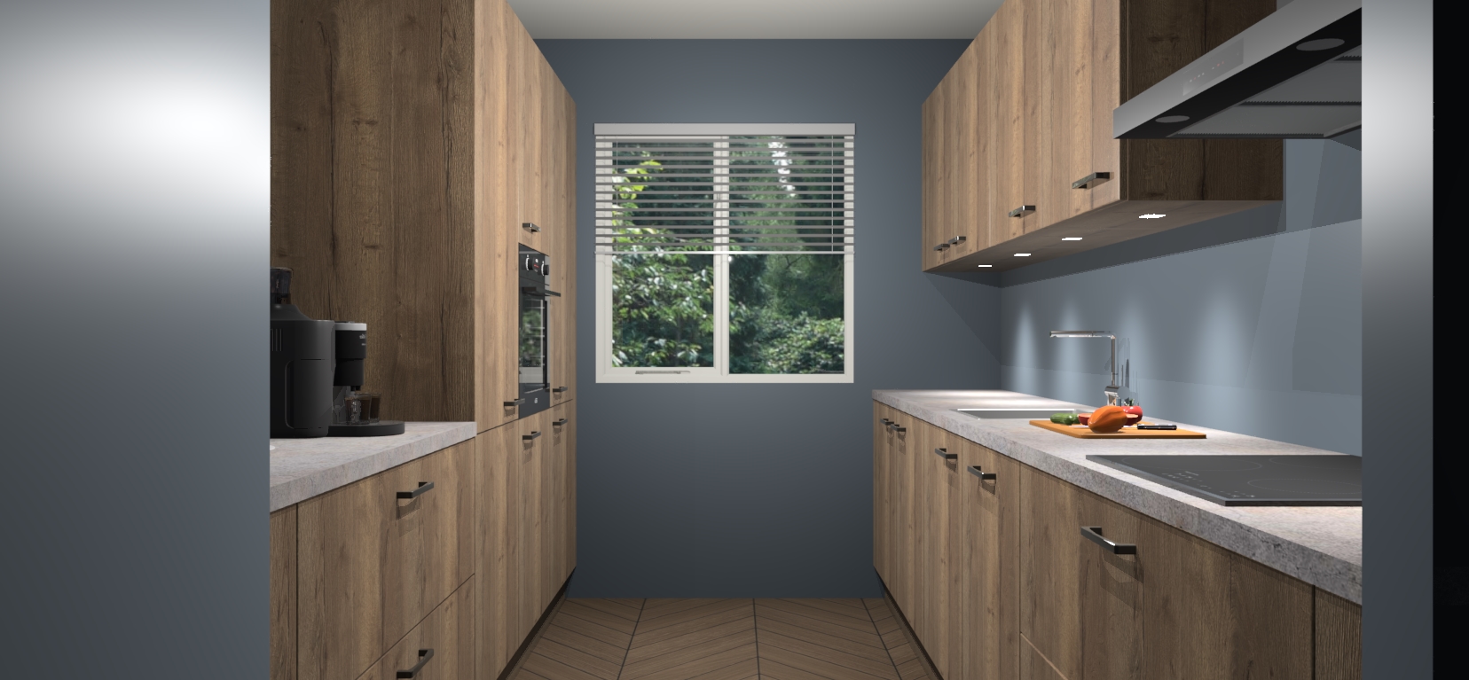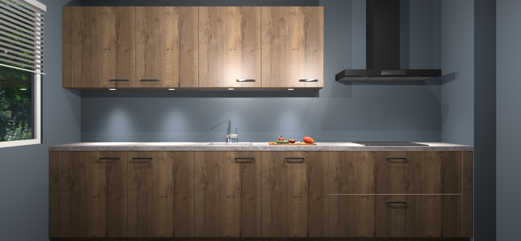 Een stijlvolle en praktische keuken als deze mag gezien worden. Dankzij de prachtige Chocolade Eiken matte afwerking wordt de keuken gemakkelijk het middelpunt van uw huis - hij ziet er geweldig uit onder allerlei lichtomstandigheden, van dag tot nacht!