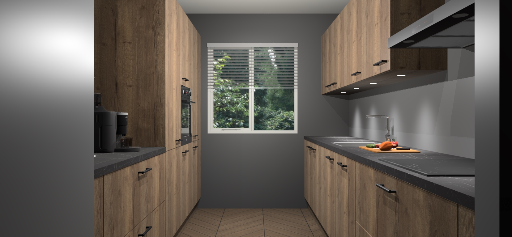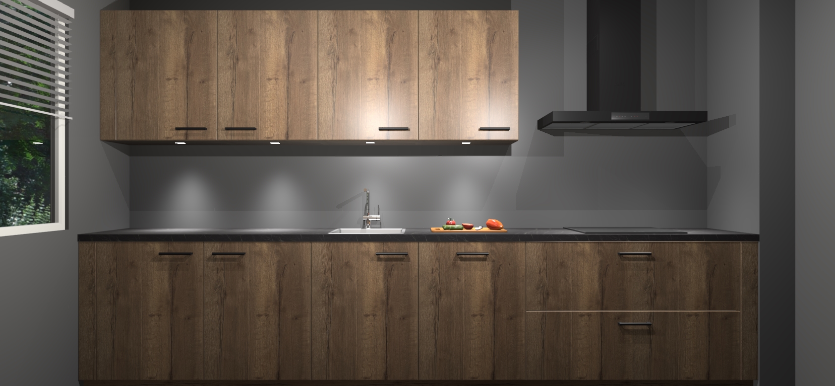 Een stijlvolle en praktische keuken als deze mag gezien worden. Dankzij de prachtige Chocolade Eiken matte afwerking wordt de keuken gemakkelijk het middelpunt van uw huis - hij ziet er geweldig uit onder allerlei lichtomstandigheden, van dag tot nacht!