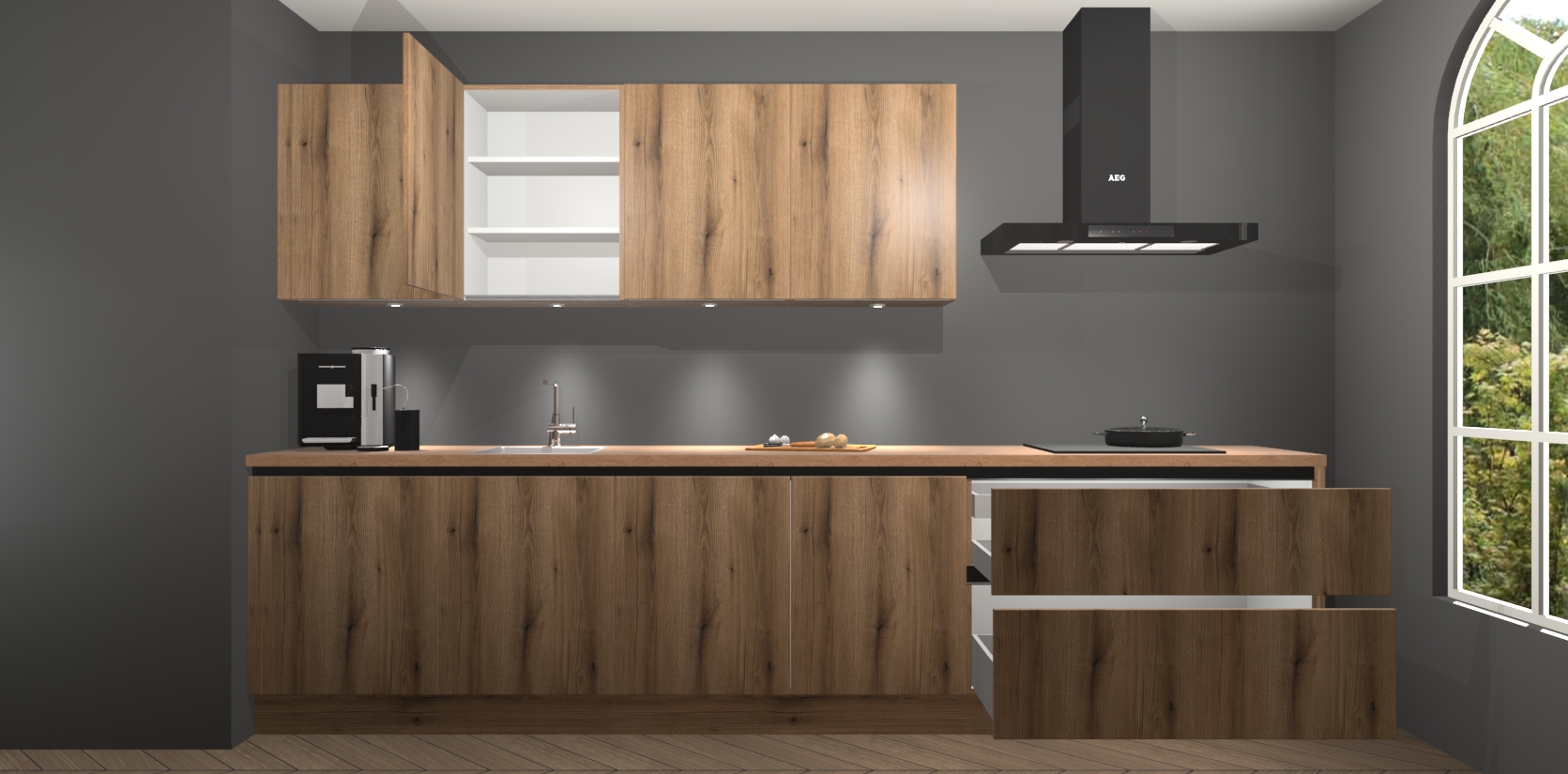 De softclose deuren openen en sluiten is ook heel eenvoudig - geniet van een moeiteloze keukenervaring, zelfs als er kinderen rondlopen. Voor extra gemak bij het plaatsen van uw bestelling bieden we ook een upgrade naar een kookplaat met geïntegreerde afzuiging.