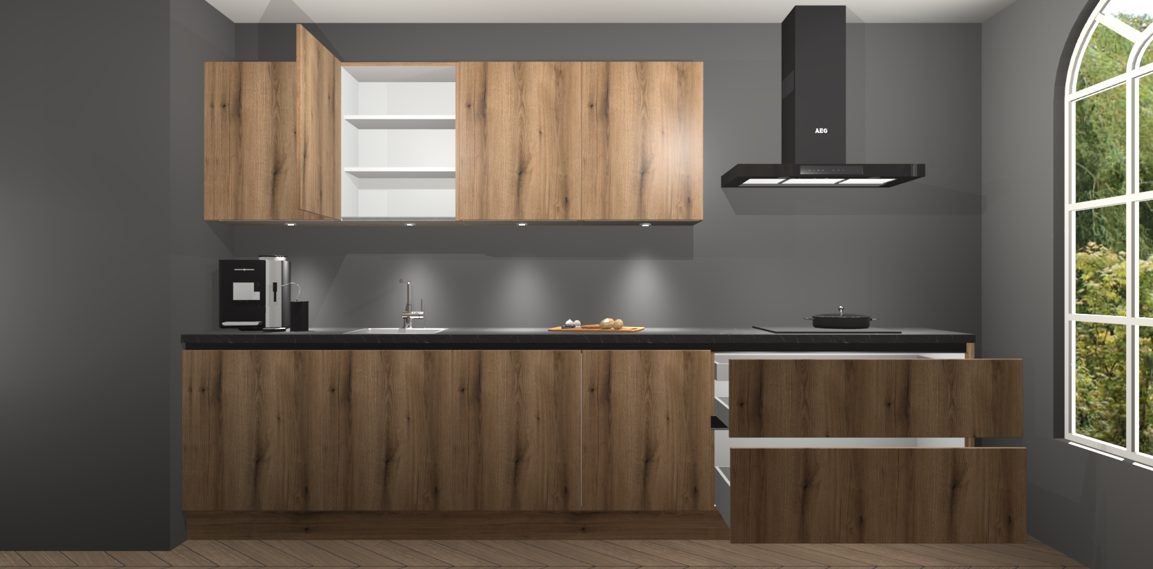 De softclose deuren openen en sluiten is ook heel eenvoudig - geniet van een moeiteloze keukenervaring, zelfs als er kinderen rondlopen. Voor extra gemak bij het plaatsen van uw bestelling bieden we ook een upgrade naar een kookplaat met geïntegreerde afzuiging.