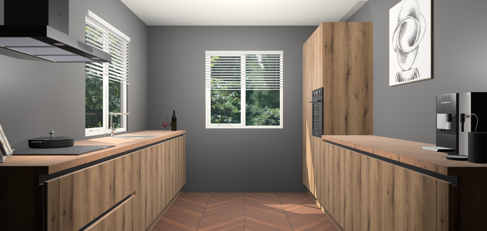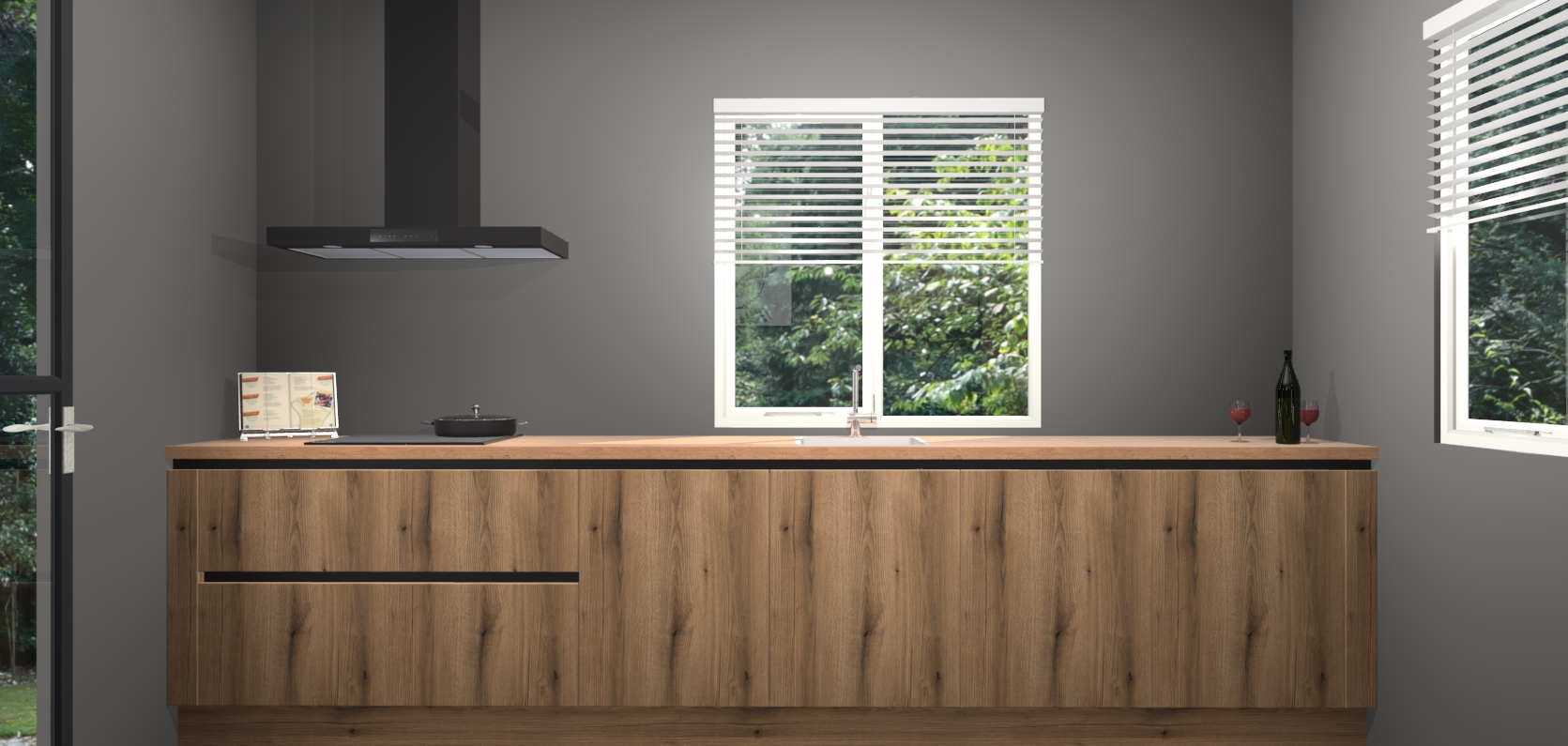 Welkom bij de Goud Eiken greeploze keuken Lusaka. Deze prachtige keuken zal de komende jaren het middelpunt van de belangstelling in uw huis zijn. Uitgerust met vijf inbouwapparaten komt u nooit kookgereedschap tekort. Bovendien geeft de warme houtlook elke ruimte een uitnodigende en tijdloze uitstraling.