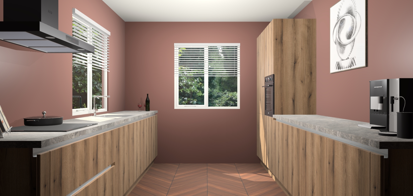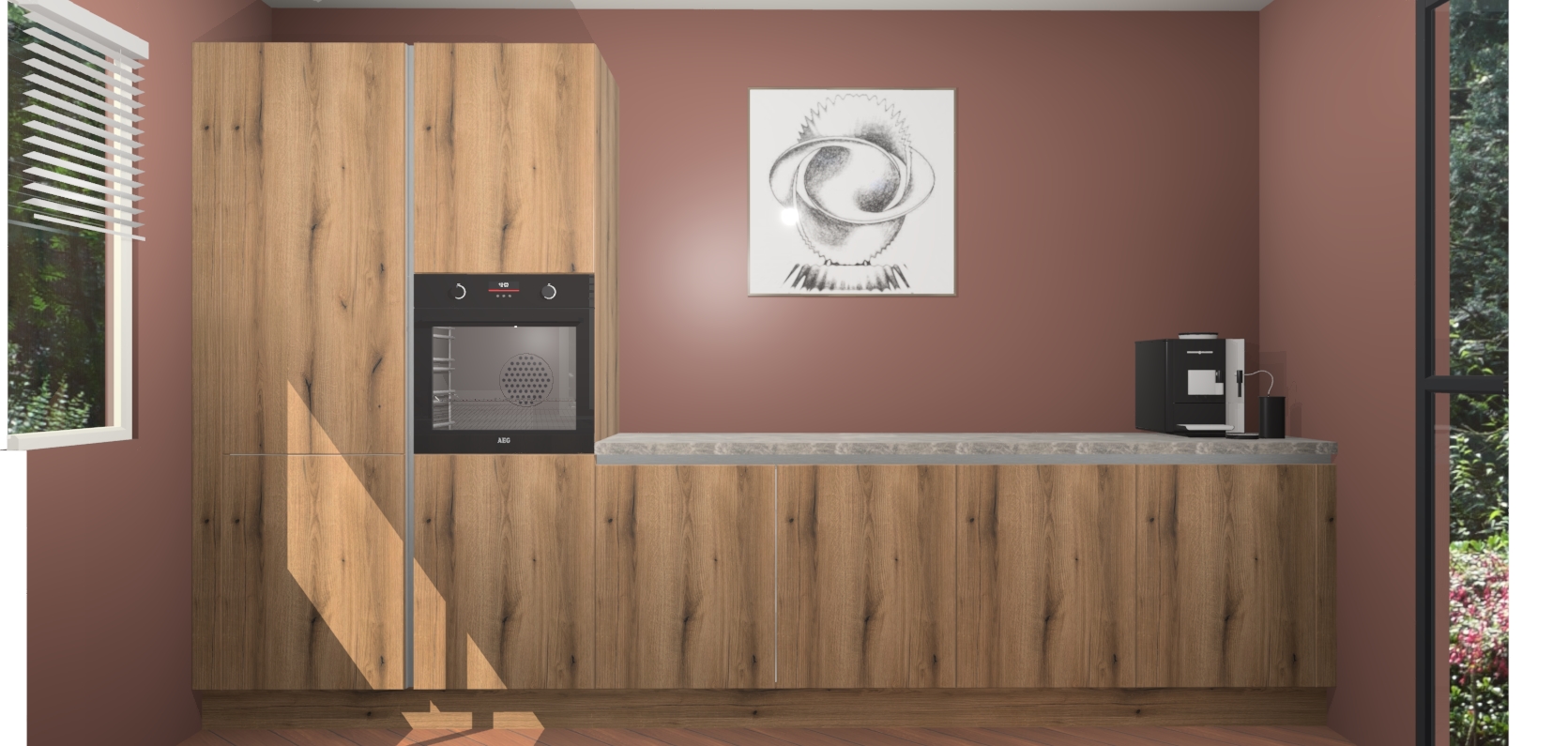 Welkom bij de Goud Eiken greeploze keuken Lusaka. Deze prachtige keuken zal de komende jaren het middelpunt van de belangstelling in uw huis zijn. Uitgerust met vijf inbouwapparaten komt u nooit kookgereedschap tekort. Bovendien geeft de warme houtlook elke ruimte een uitnodigende en tijdloze uitstraling.