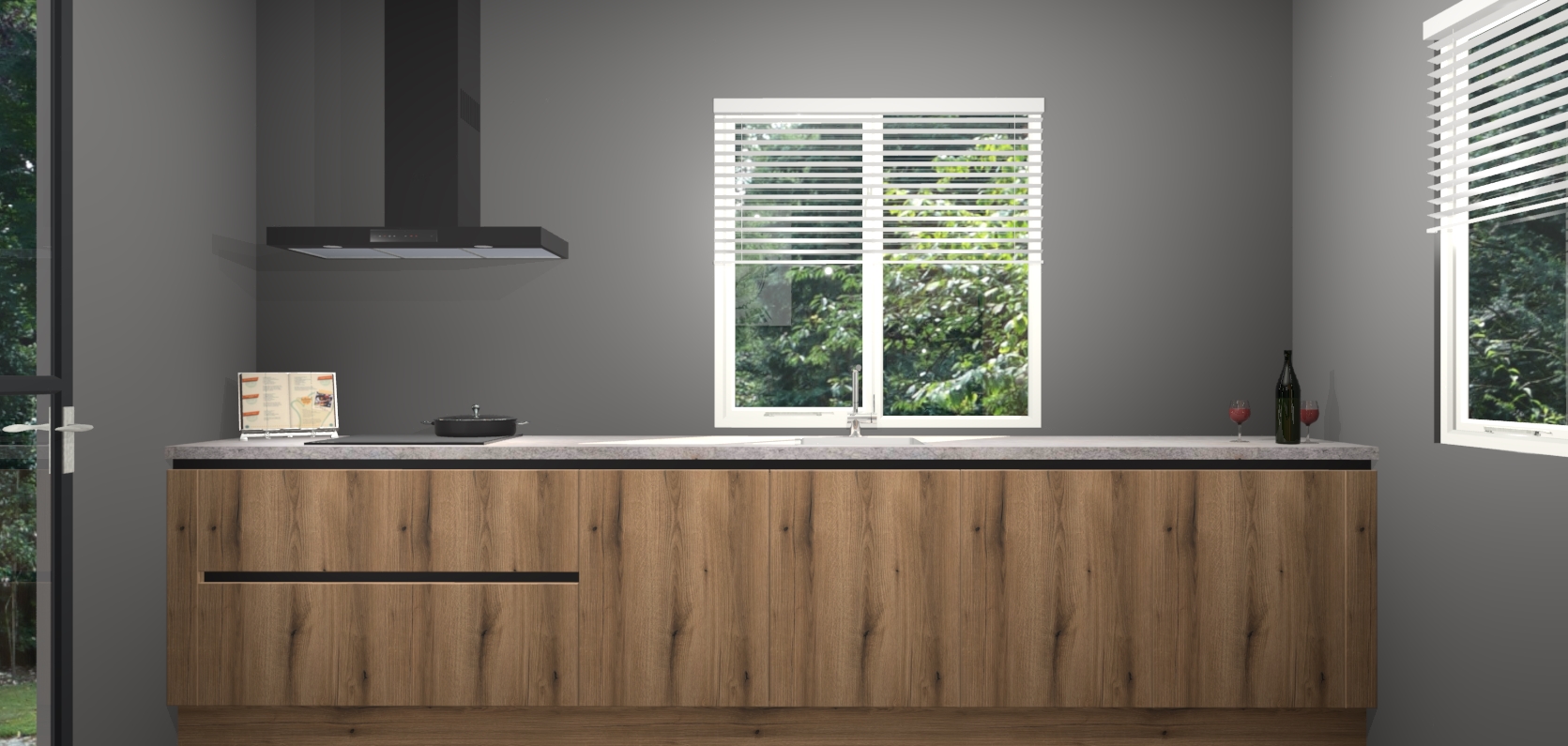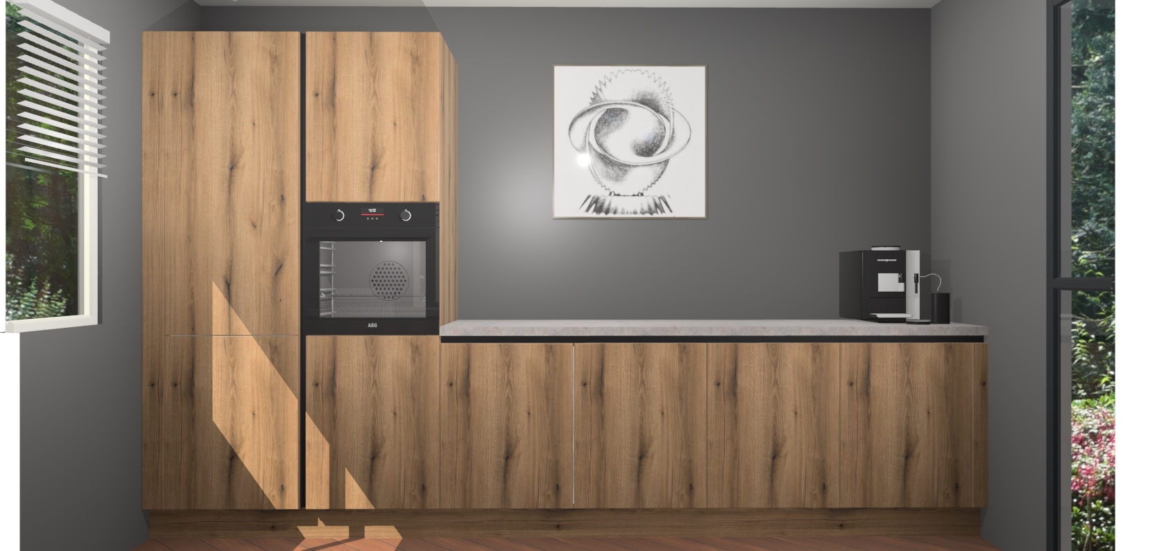 Welkom bij de Goud Eiken greeploze keuken Lusaka. Deze prachtige keuken zal de komende jaren het middelpunt van de belangstelling in uw huis zijn. Uitgerust met vijf inbouwapparaten komt u nooit kookgereedschap tekort. Bovendien geeft de warme houtlook elke ruimte een uitnodigende en tijdloze uitstraling.