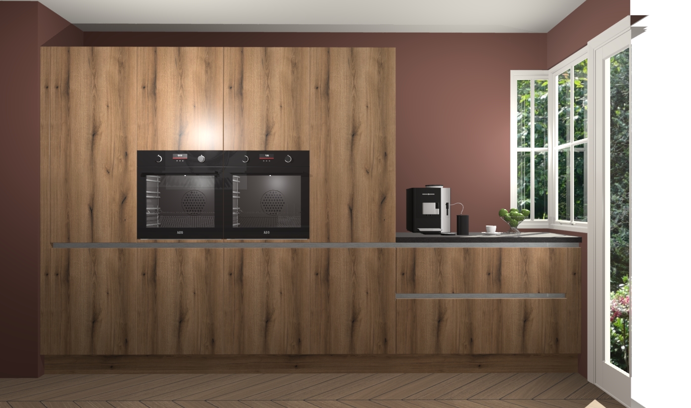 Een stijlvolle en praktische keuken als deze mag gezien worden. Dankzij de prachtige goud eiken matte afwerking wordt de keuken gemakkelijk het middelpunt van uw huis - hij ziet er geweldig uit onder allerlei lichtomstandigheden, van dag tot nacht!