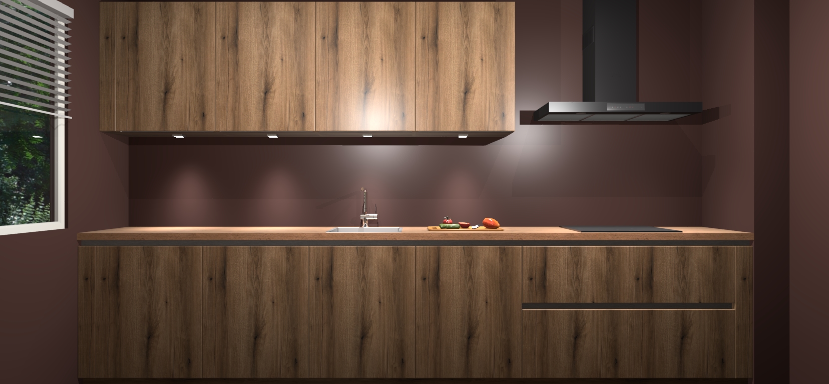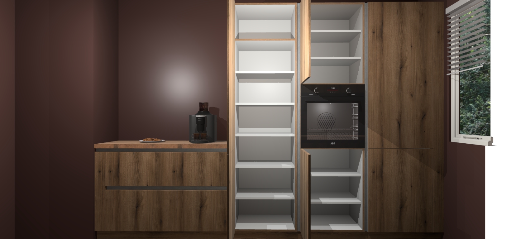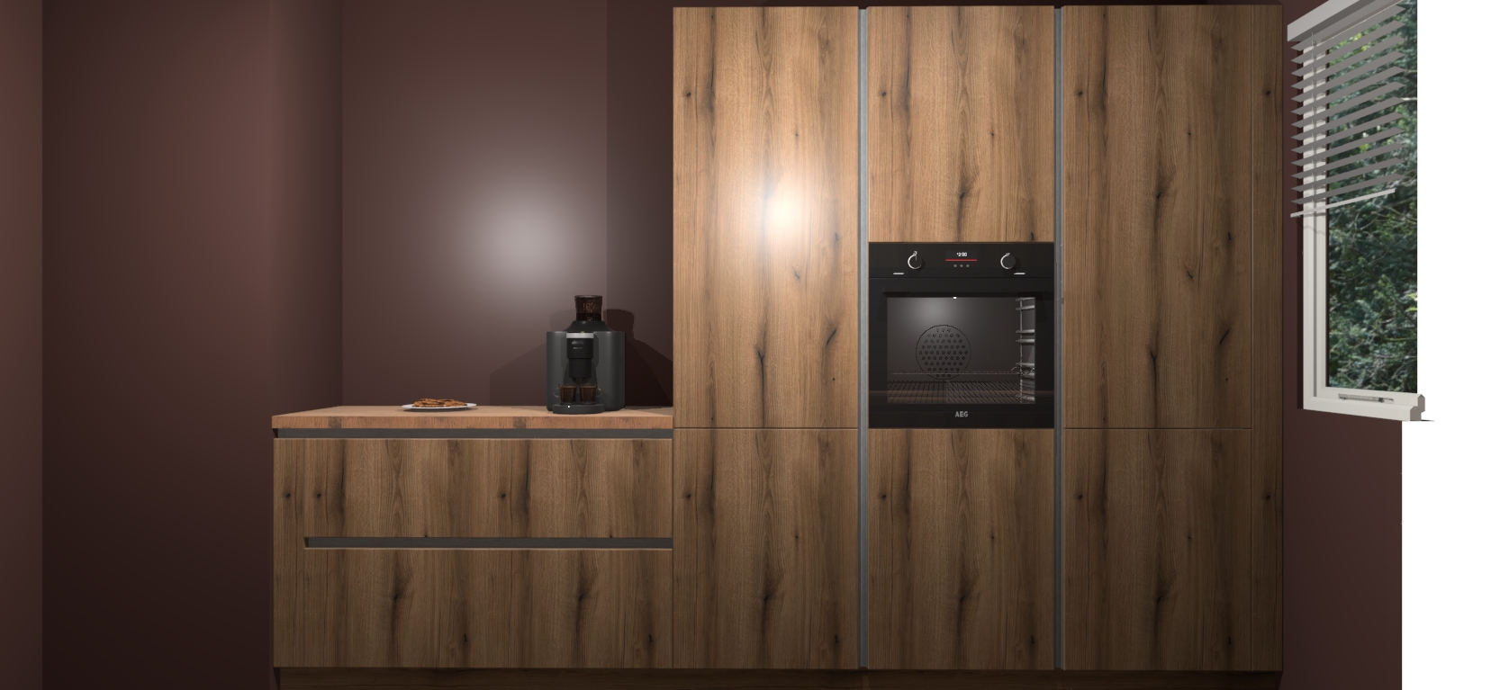 Een stijlvolle en praktische keuken als deze mag gezien worden. Dankzij de prachtige Goud Eiken matte afwerking wordt de keuken gemakkelijk het middelpunt van uw huis - hij ziet er geweldig uit onder allerlei lichtomstandigheden, van dag tot nacht!