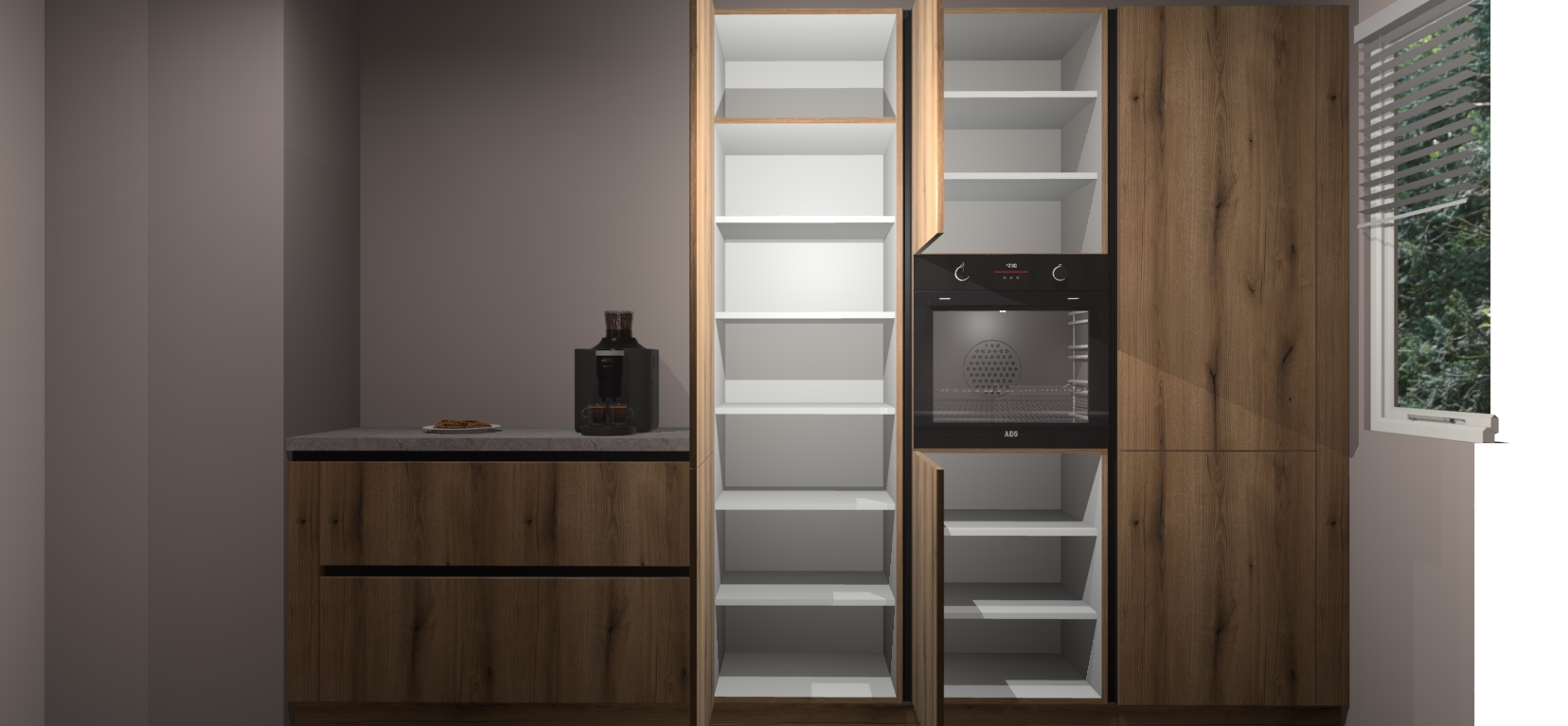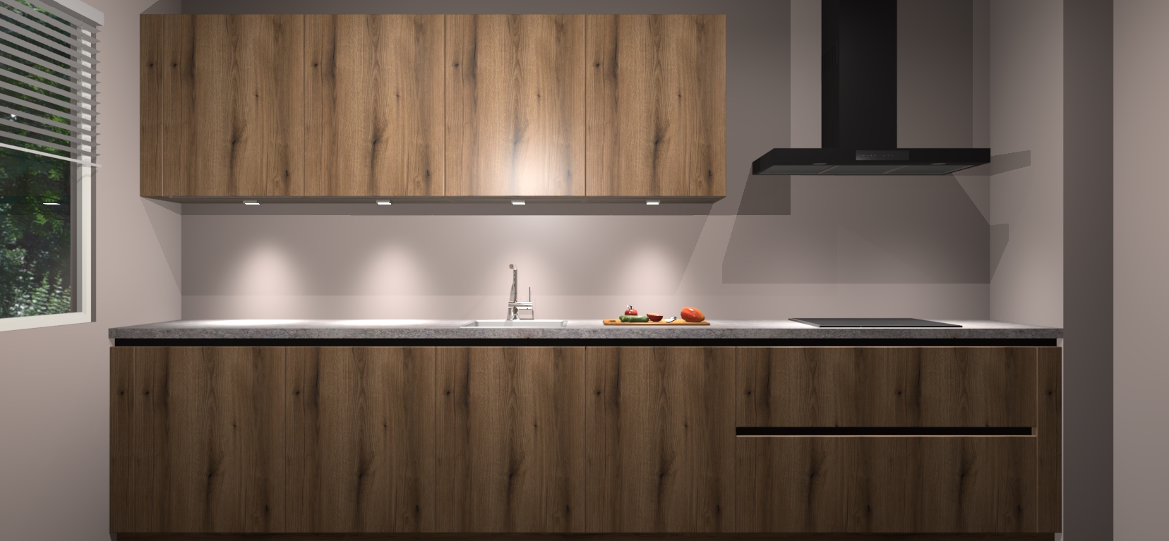 Een stijlvolle en praktische keuken als deze mag gezien worden. Dankzij de prachtige Goud Eiken matte afwerking wordt de keuken gemakkelijk het middelpunt van uw huis - hij ziet er geweldig uit onder allerlei lichtomstandigheden, van dag tot nacht!