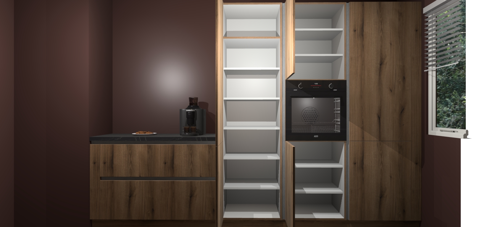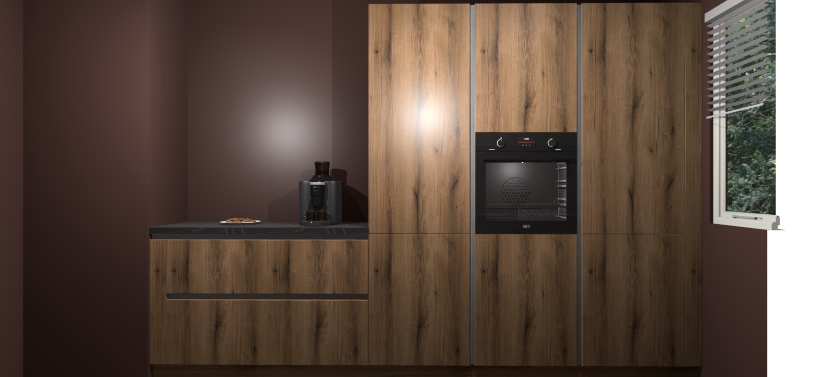 Een stijlvolle en praktische keuken als deze mag gezien worden. Dankzij de prachtige Goud Eiken matte afwerking wordt de keuken gemakkelijk het middelpunt van uw huis - hij ziet er geweldig uit onder allerlei lichtomstandigheden, van dag tot nacht!