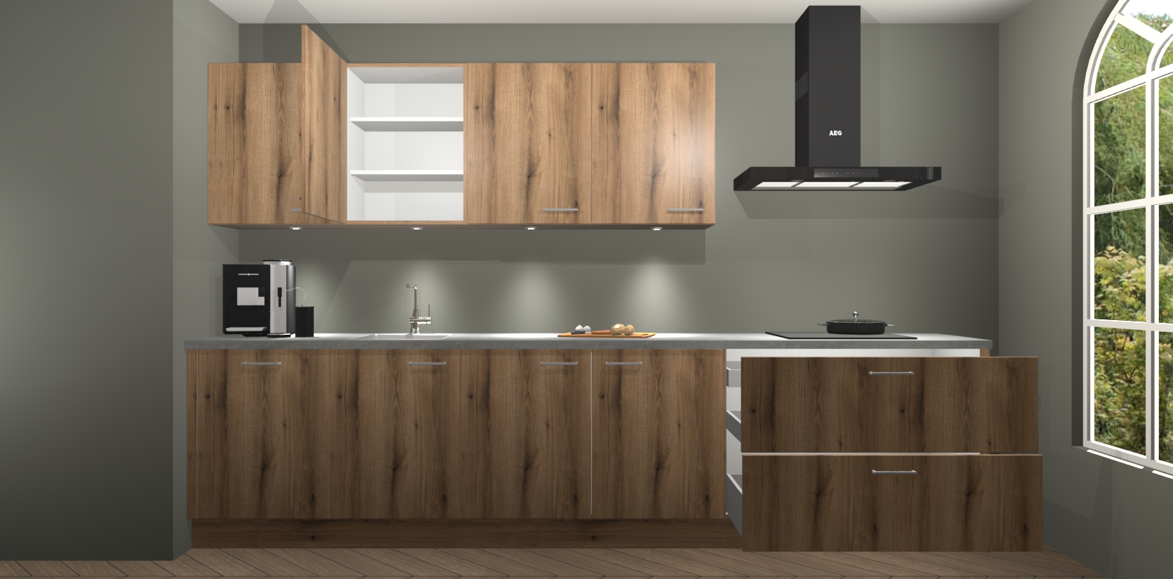 De softclose deuren openen en sluiten is ook heel eenvoudig - geniet van een moeiteloze keukenervaring, zelfs als er kinderen rondlopen. Voor extra gemak bij het plaatsen van uw bestelling bieden we ook een upgrade naar een kookplaat met geïntegreerde afzuiging.