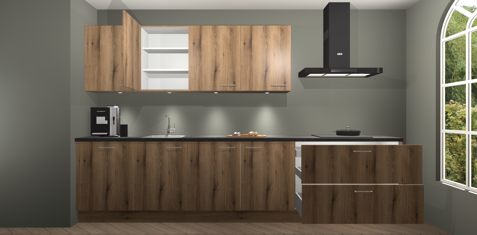 De softclose deuren openen en sluiten is ook heel eenvoudig - geniet van een moeiteloze keukenervaring, zelfs als er kinderen rondlopen. Voor extra gemak bij het plaatsen van uw bestelling bieden we ook een upgrade naar een kookplaat met geïntegreerde afzuiging.