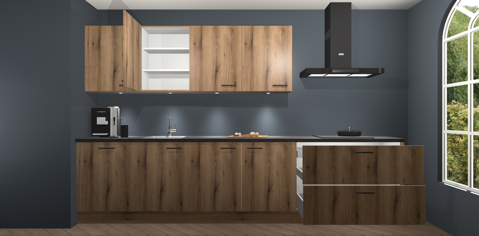 De softclose deuren openen en sluiten is ook heel eenvoudig - geniet van een moeiteloze keukenervaring, zelfs als er kinderen rondlopen. Voor extra gemak bij het plaatsen van uw bestelling bieden we ook een upgrade naar een kookplaat met geïntegreerde afzuiging.