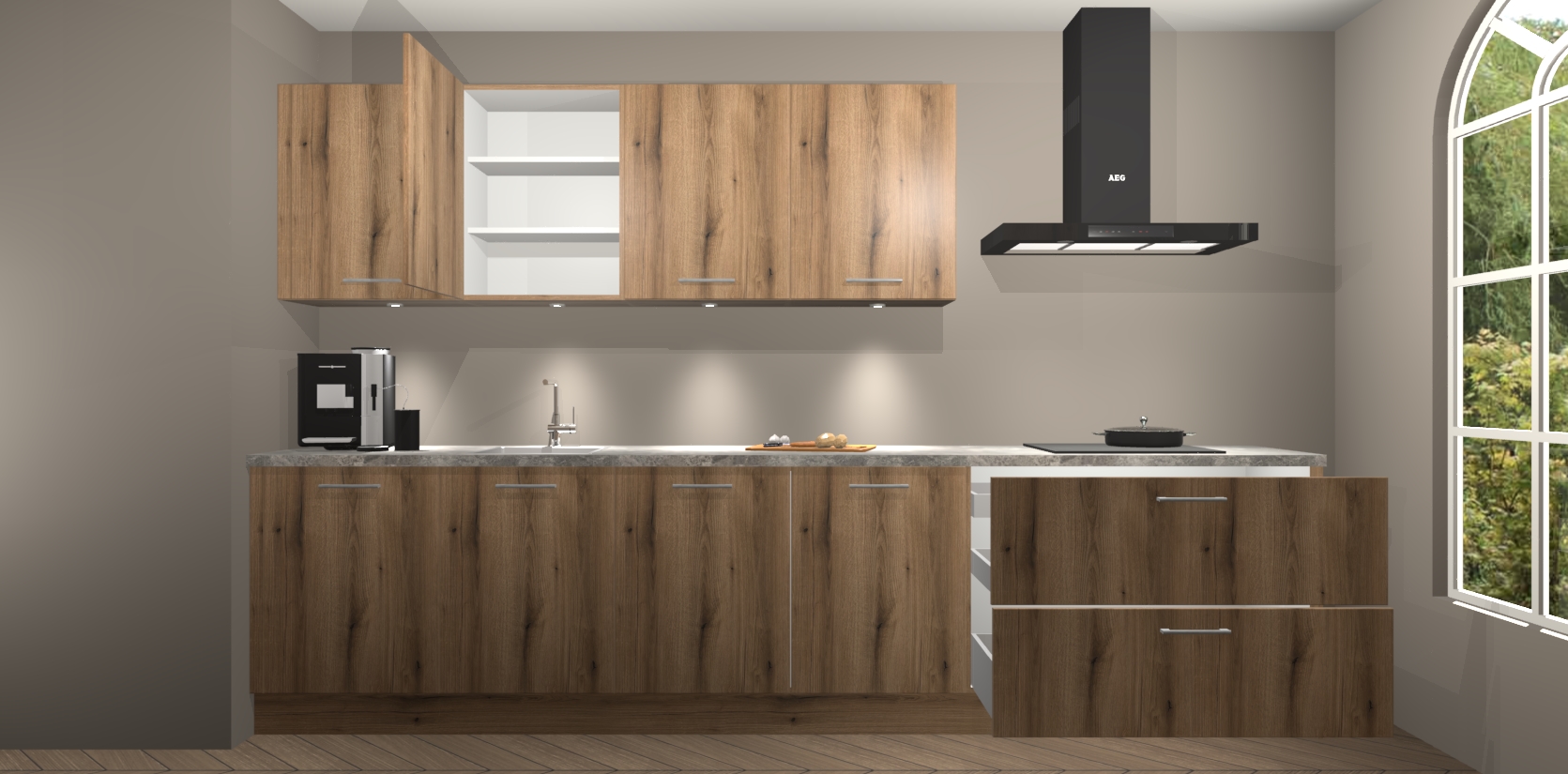 De softclose deuren openen en sluiten is ook heel eenvoudig - geniet van een moeiteloze keukenervaring, zelfs als er kinderen rondlopen. Voor extra gemak bij het plaatsen van uw bestelling bieden we ook een upgrade naar een kookplaat met geïntegreerde afzuiging.