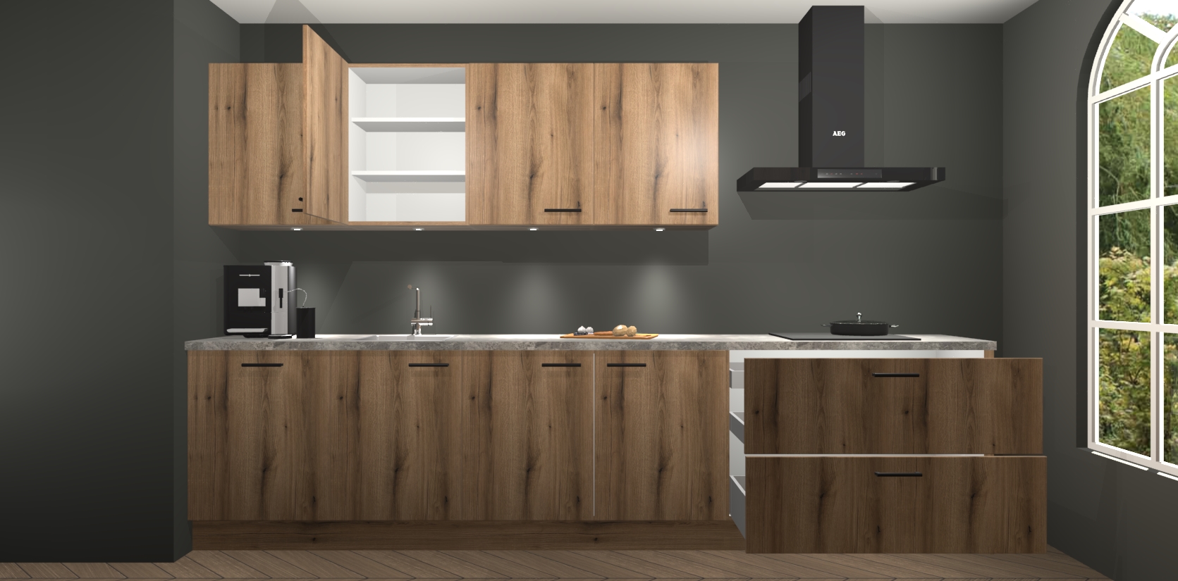De softclose deuren openen en sluiten is ook heel eenvoudig - geniet van een moeiteloze keukenervaring, zelfs als er kinderen rondlopen. Voor extra gemak bij het plaatsen van uw bestelling bieden we ook een upgrade naar een kookplaat met geïntegreerde afzuiging.