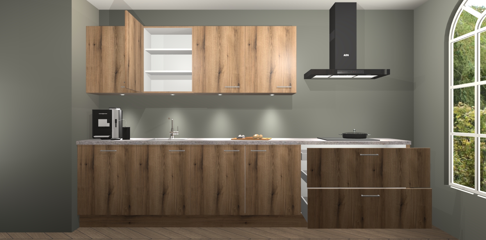 De softclose deuren openen en sluiten is ook heel eenvoudig - geniet van een moeiteloze keukenervaring, zelfs als er kinderen rondlopen. Voor extra gemak bij het plaatsen van uw bestelling bieden we ook een upgrade naar een kookplaat met geïntegreerde afzuiging.