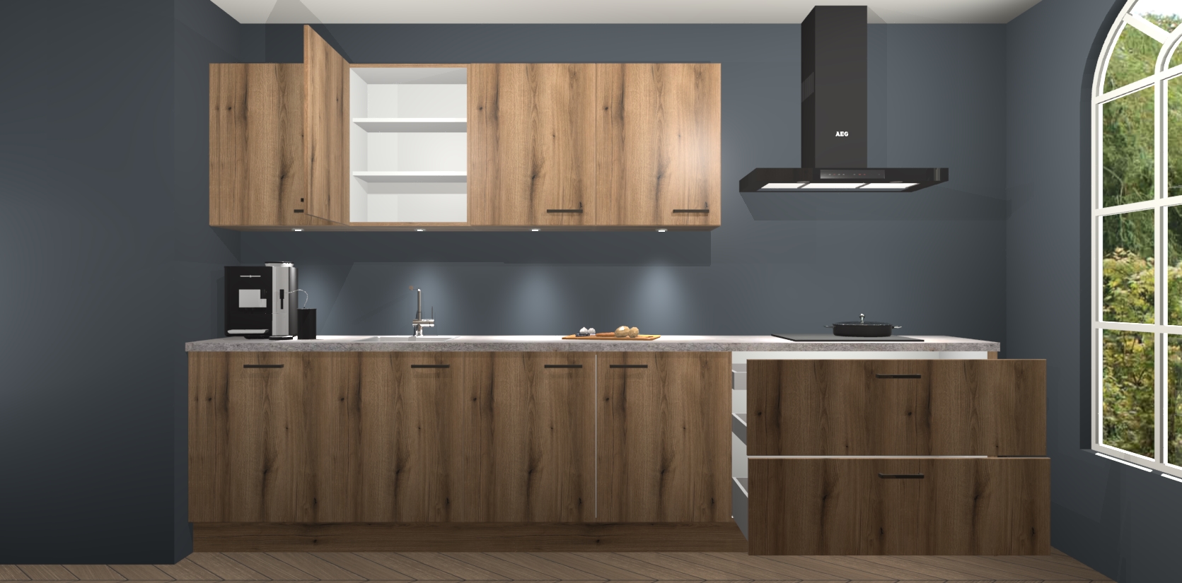 De softclose deuren openen en sluiten is ook heel eenvoudig - geniet van een moeiteloze keukenervaring, zelfs als er kinderen rondlopen. Voor extra gemak bij het plaatsen van uw bestelling bieden we ook een upgrade naar een kookplaat met geïntegreerde afzuiging.