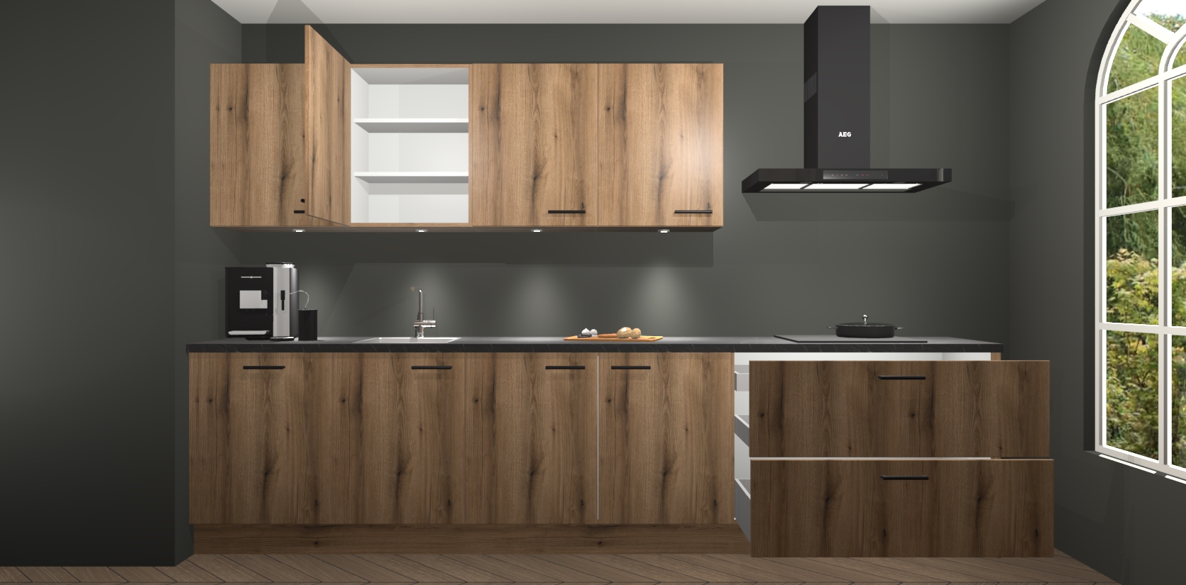 De softclose deuren openen en sluiten is ook heel eenvoudig - geniet van een moeiteloze keukenervaring, zelfs als er kinderen rondlopen. Voor extra gemak bij het plaatsen van uw bestelling bieden we ook een upgrade naar een kookplaat met geïntegreerde afzuiging.
