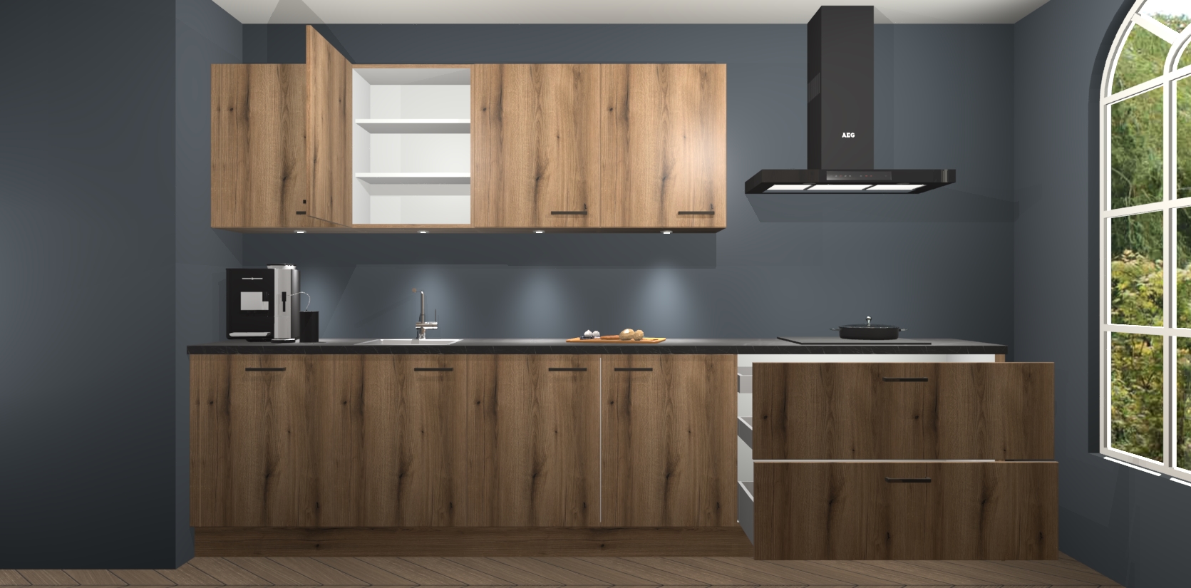 De softclose deuren openen en sluiten is ook heel eenvoudig - geniet van een moeiteloze keukenervaring, zelfs als er kinderen rondlopen. Voor extra gemak bij het plaatsen van uw bestelling bieden we ook een upgrade naar een kookplaat met geïntegreerde afzuiging.