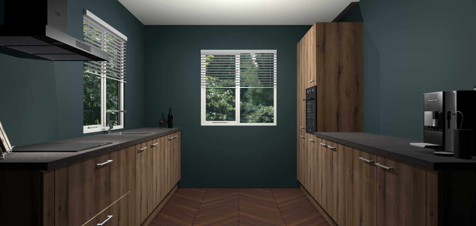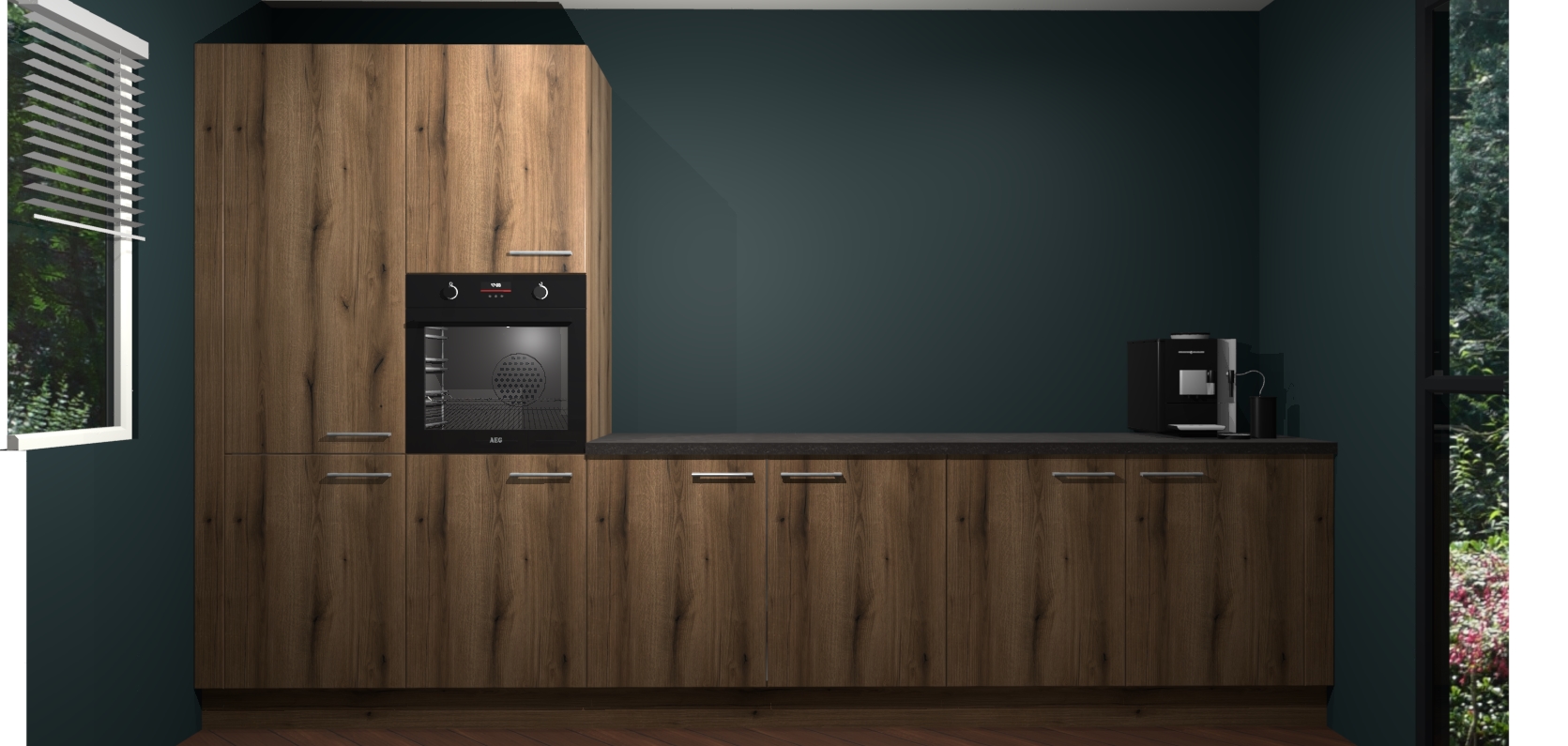 Welkom bij de Goud Eiken keuken Lusaka. Deze prachtige keuken zal de komende jaren het middelpunt van de belangstelling in uw huis zijn. Uitgerust met vijf inbouwapparaten komt u nooit kookgereedschap tekort. Bovendien geeft de warme houtlook elke ruimte een uitnodigende en tijdloze uitstraling.