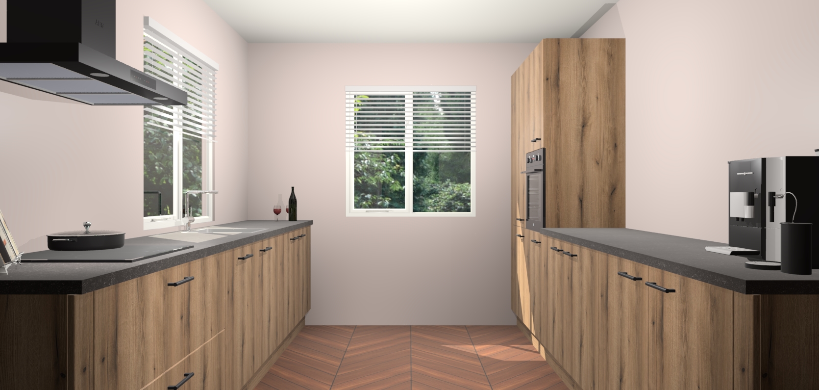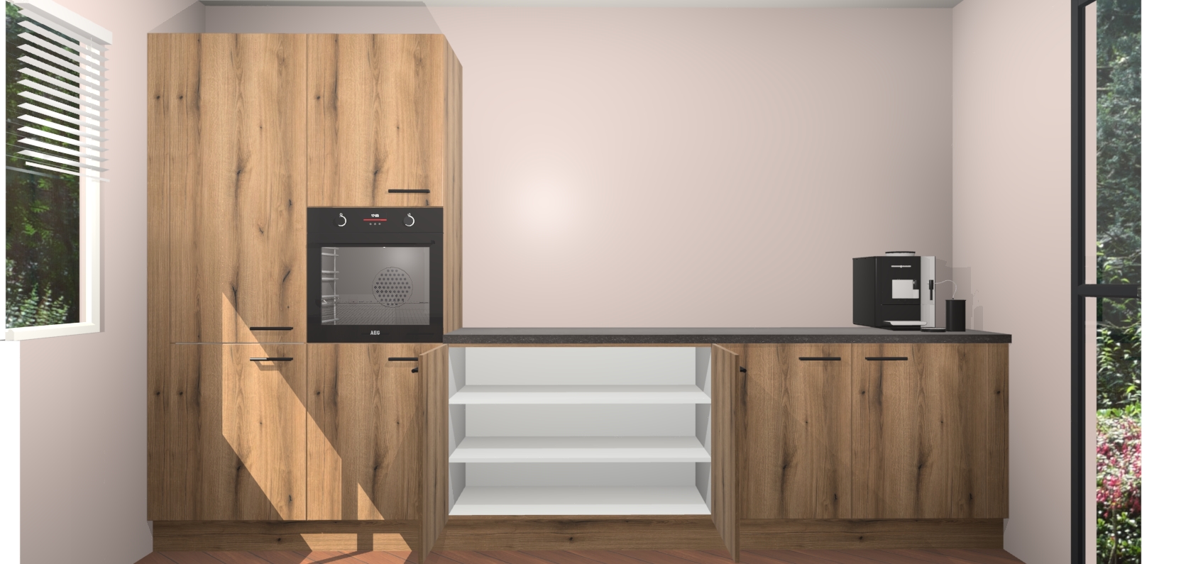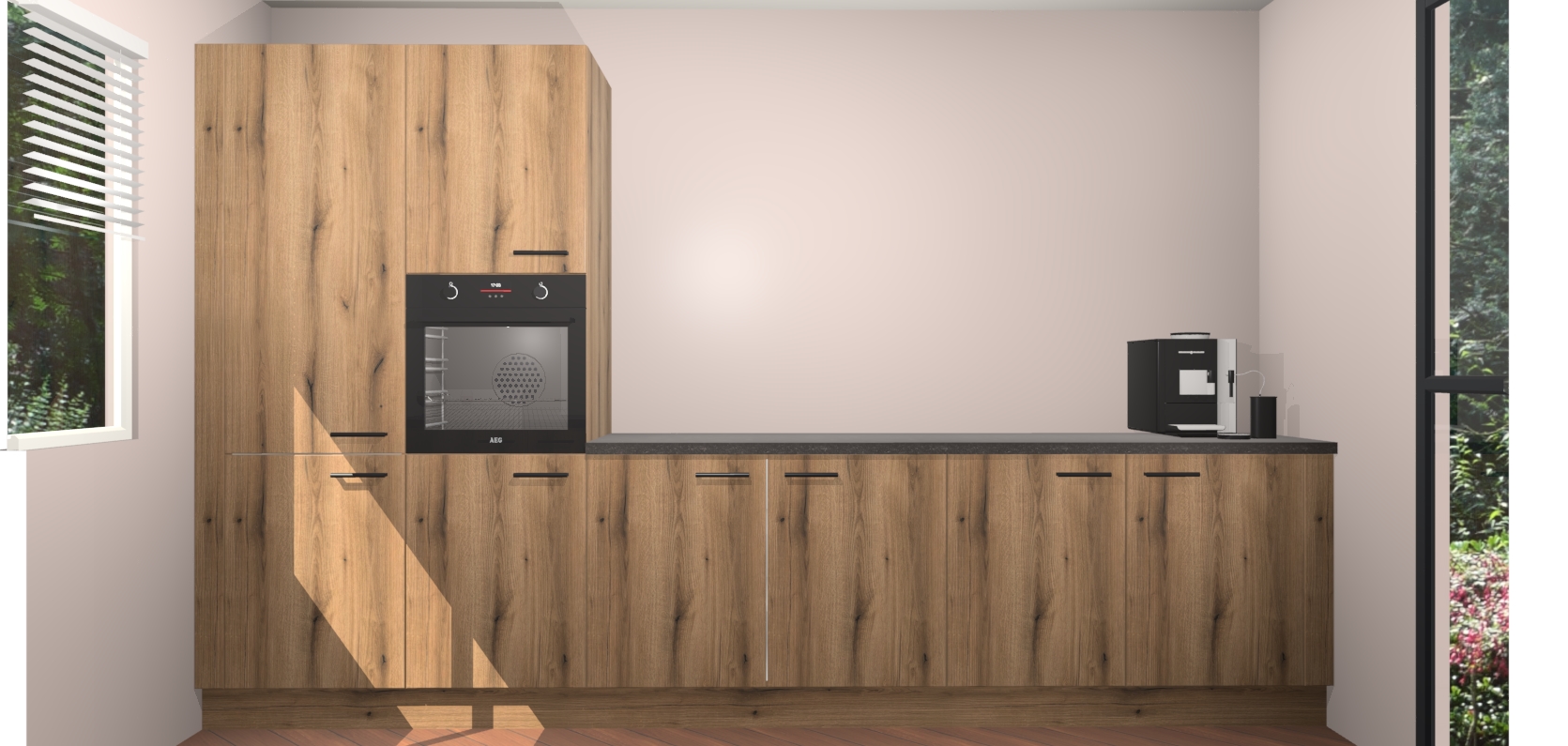 Welkom bij de Goud Eiken keuken Lusaka. Deze prachtige keuken zal de komende jaren het middelpunt van de belangstelling in uw huis zijn. Uitgerust met vijf inbouwapparaten komt u nooit kookgereedschap tekort. Bovendien geeft de warme houtlook elke ruimte een uitnodigende en tijdloze uitstraling.