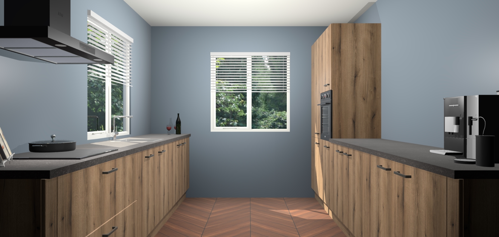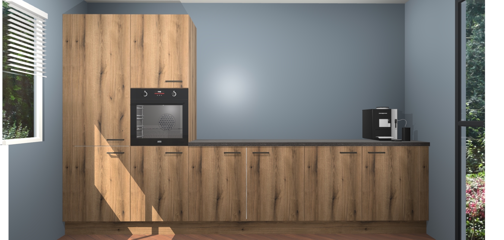 Welkom bij de Goud Eiken keuken Lusaka. Deze prachtige keuken zal de komende jaren het middelpunt van de belangstelling in uw huis zijn. Uitgerust met vijf inbouwapparaten komt u nooit kookgereedschap tekort. Bovendien geeft de warme houtlook elke ruimte een uitnodigende en tijdloze uitstraling.