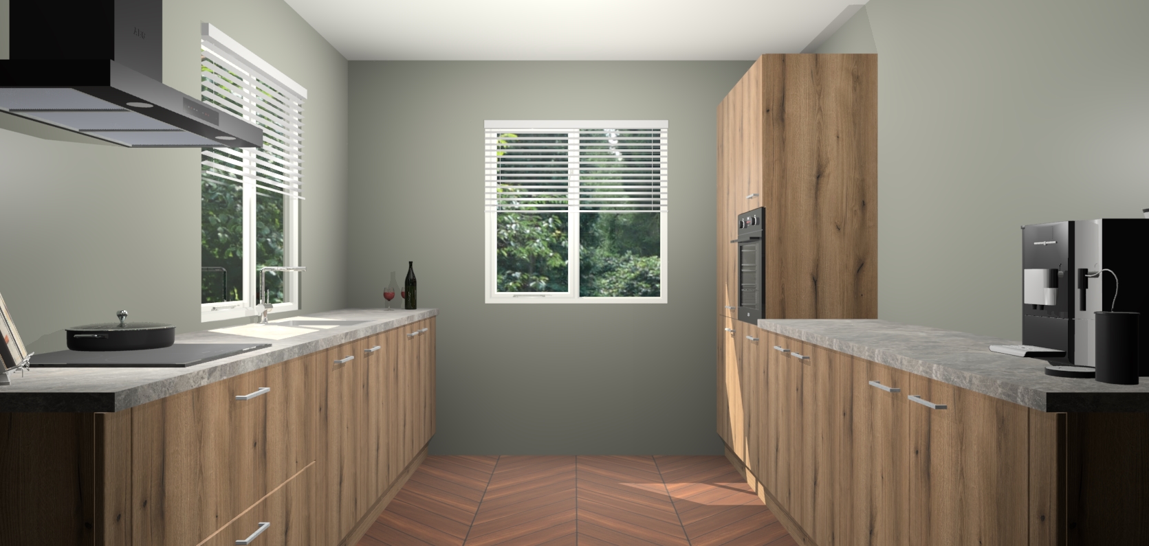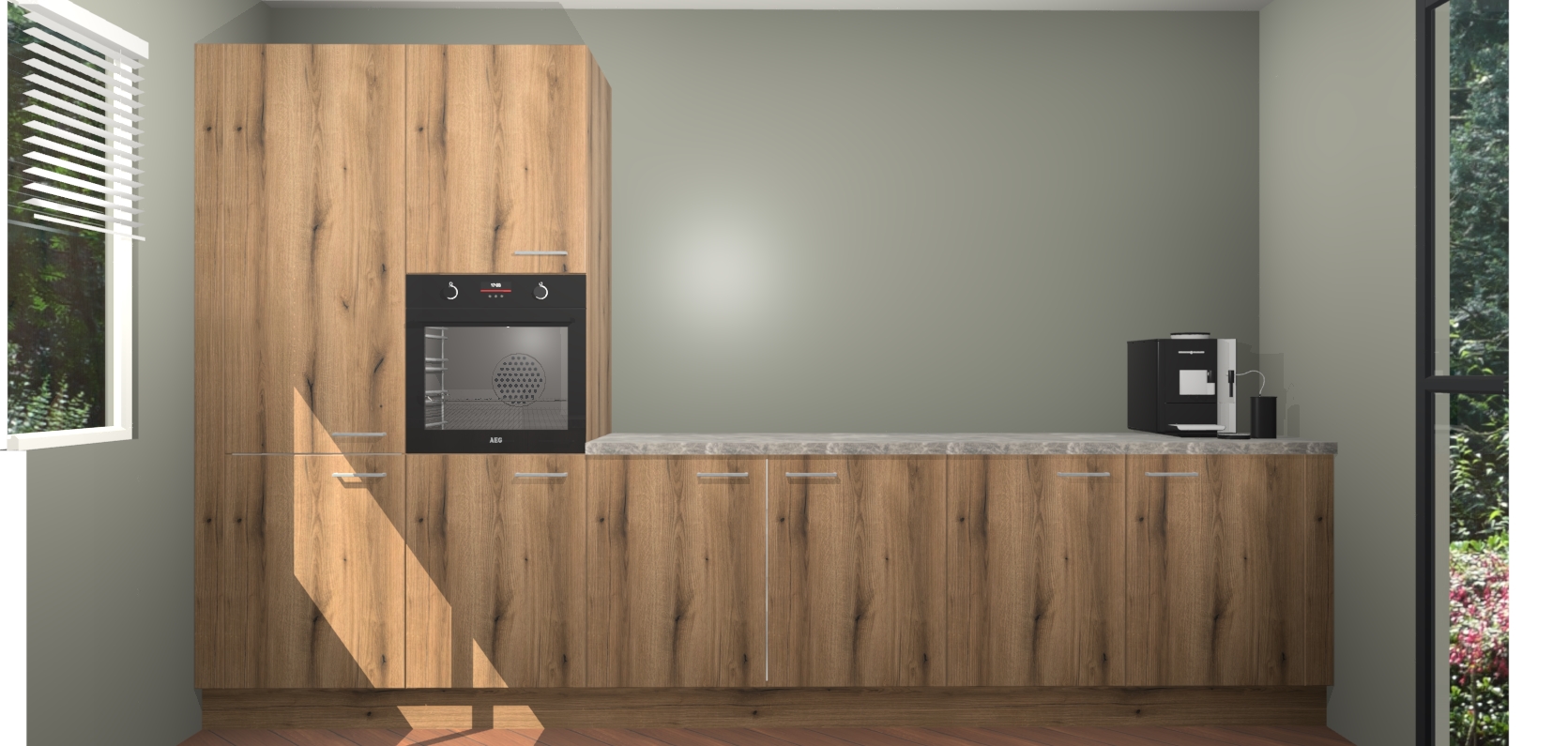 Welkom bij de Goud Eiken keuken Lusaka. Deze prachtige keuken zal de komende jaren het middelpunt van de belangstelling in uw huis zijn. Uitgerust met vijf inbouwapparaten komt u nooit kookgereedschap tekort. Bovendien geeft de warme houtlook elke ruimte een uitnodigende en tijdloze uitstraling.