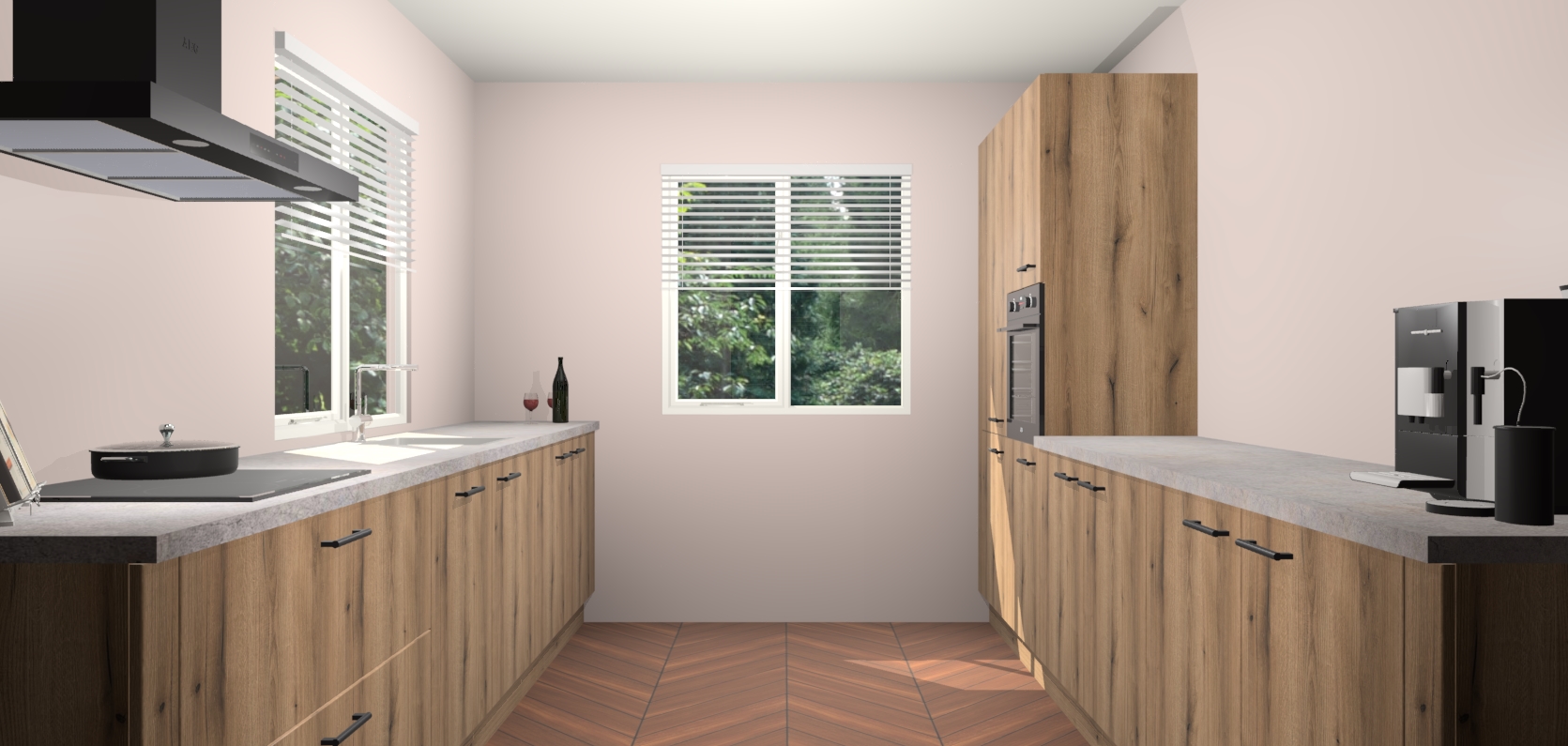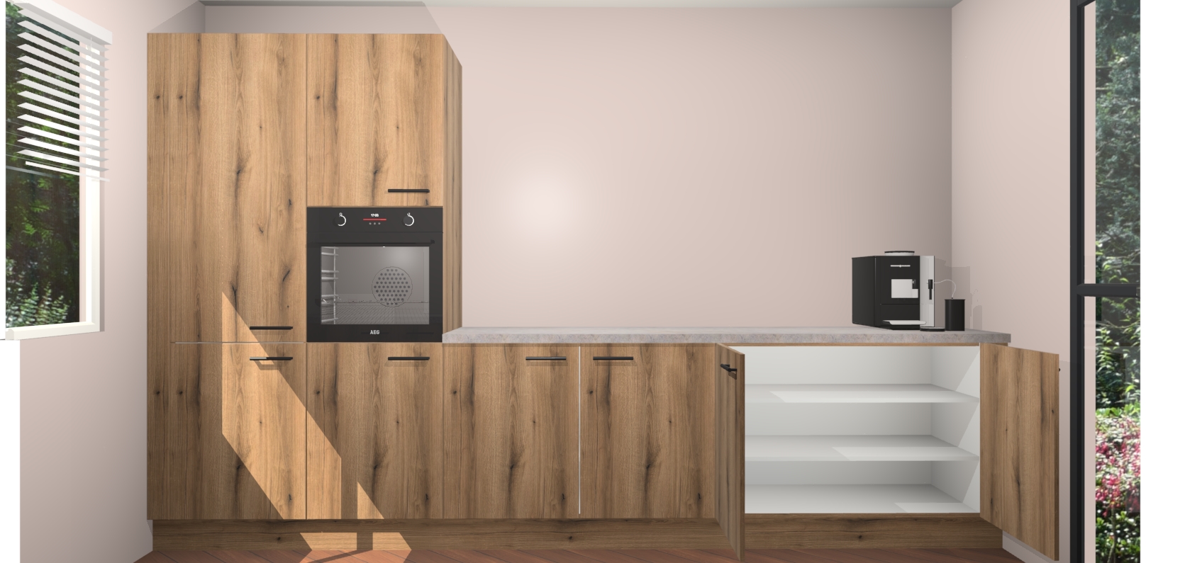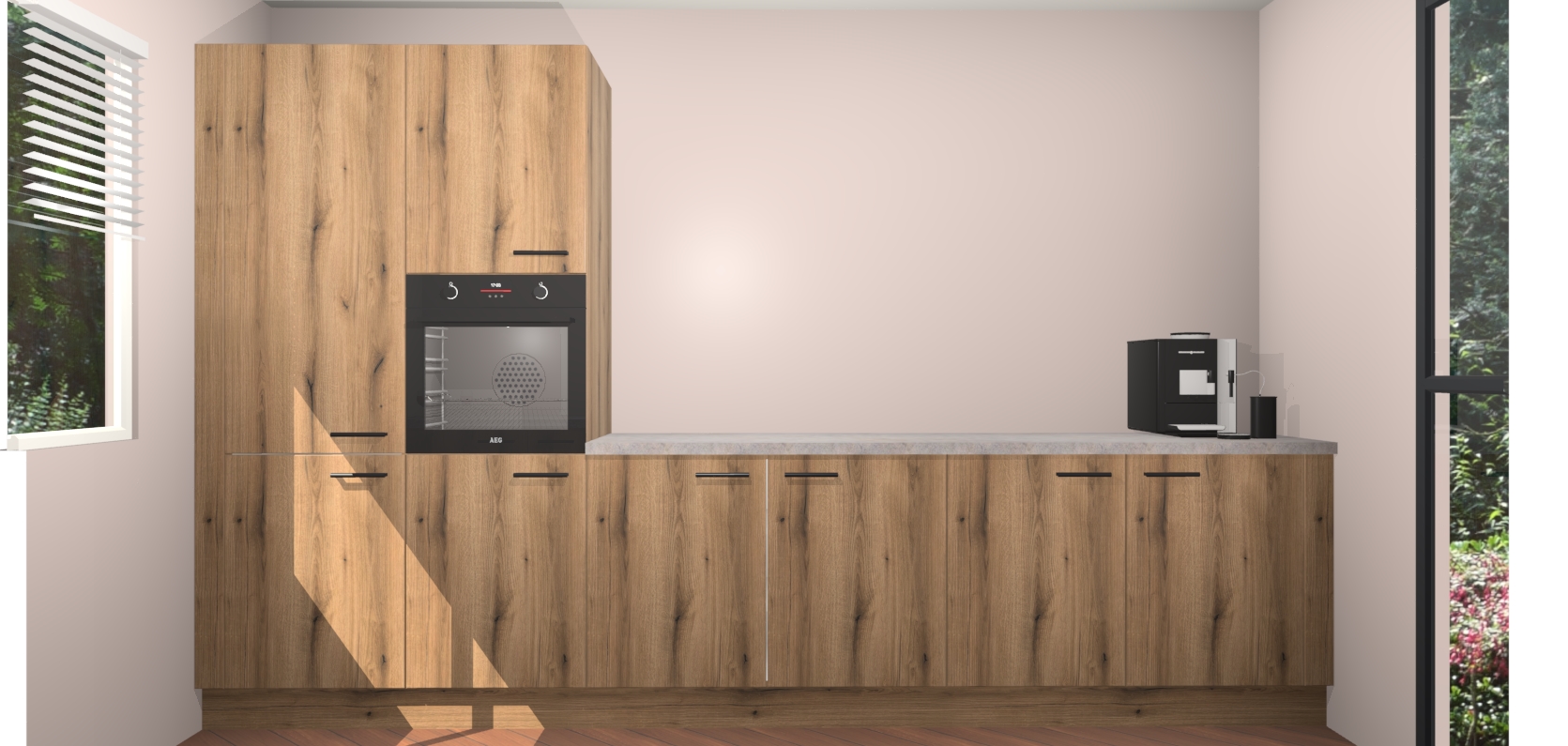 Welkom bij de Goud Eiken keuken Lusaka. Deze prachtige keuken zal de komende jaren het middelpunt van de belangstelling in uw huis zijn. Uitgerust met vijf inbouwapparaten komt u nooit kookgereedschap tekort. Bovendien geeft de warme houtlook elke ruimte een uitnodigende en tijdloze uitstraling.