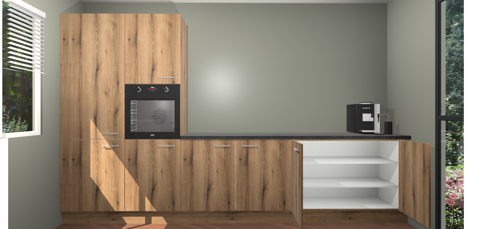 Welkom bij de Goud Eiken keuken Lusaka. Deze prachtige keuken zal de komende jaren het middelpunt van de belangstelling in uw huis zijn. Uitgerust met vijf inbouwapparaten komt u nooit kookgereedschap tekort. Bovendien geeft de warme houtlook elke ruimte een uitnodigende en tijdloze uitstraling.