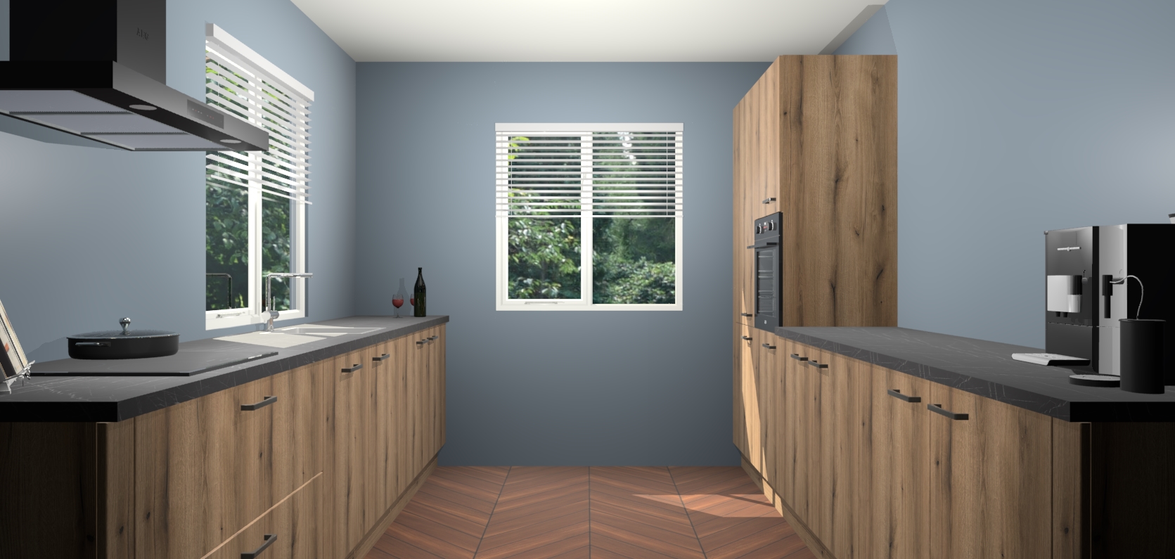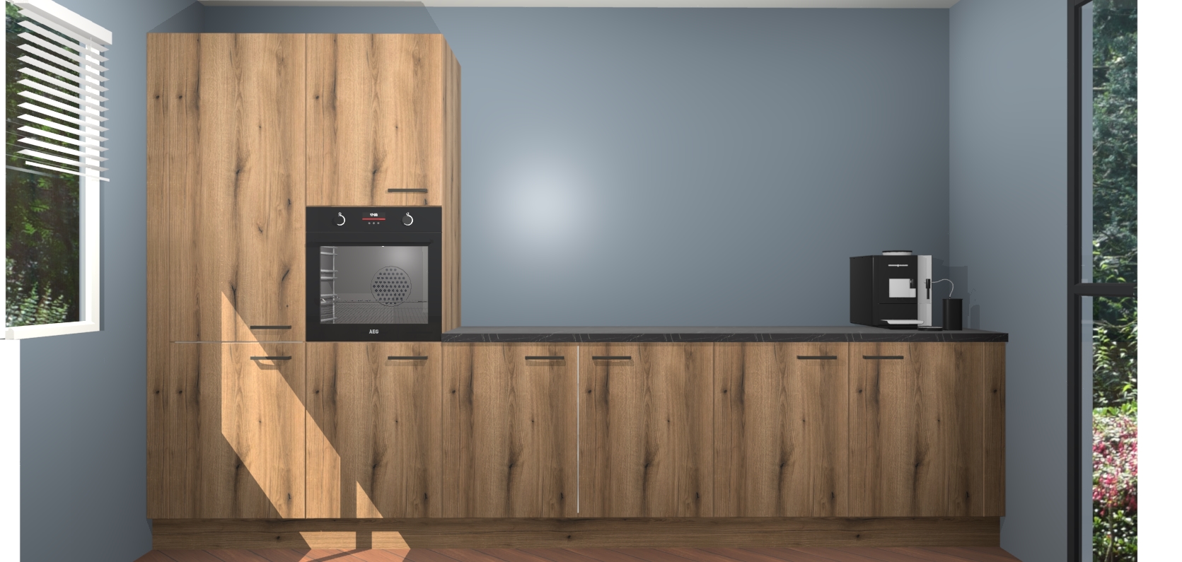 Welkom bij de Goud Eiken keuken Lusaka. Deze prachtige keuken zal de komende jaren het middelpunt van de belangstelling in uw huis zijn. Uitgerust met vijf inbouwapparaten komt u nooit kookgereedschap tekort. Bovendien geeft de warme houtlook elke ruimte een uitnodigende en tijdloze uitstraling.