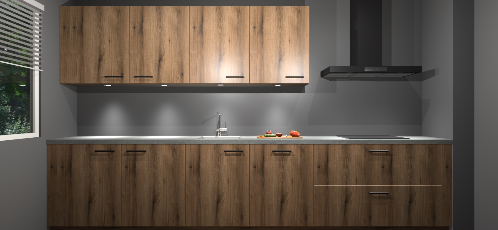 Een stijlvolle en praktische keuken als deze mag gezien worden. Dankzij de prachtige Goud Eiken matte afwerking wordt de keuken gemakkelijk het middelpunt van uw huis - hij ziet er geweldig uit onder allerlei lichtomstandigheden, van dag tot nacht!