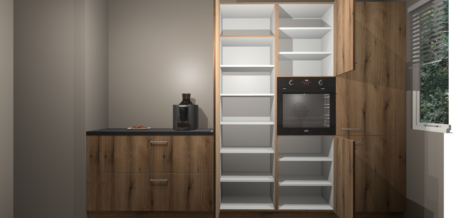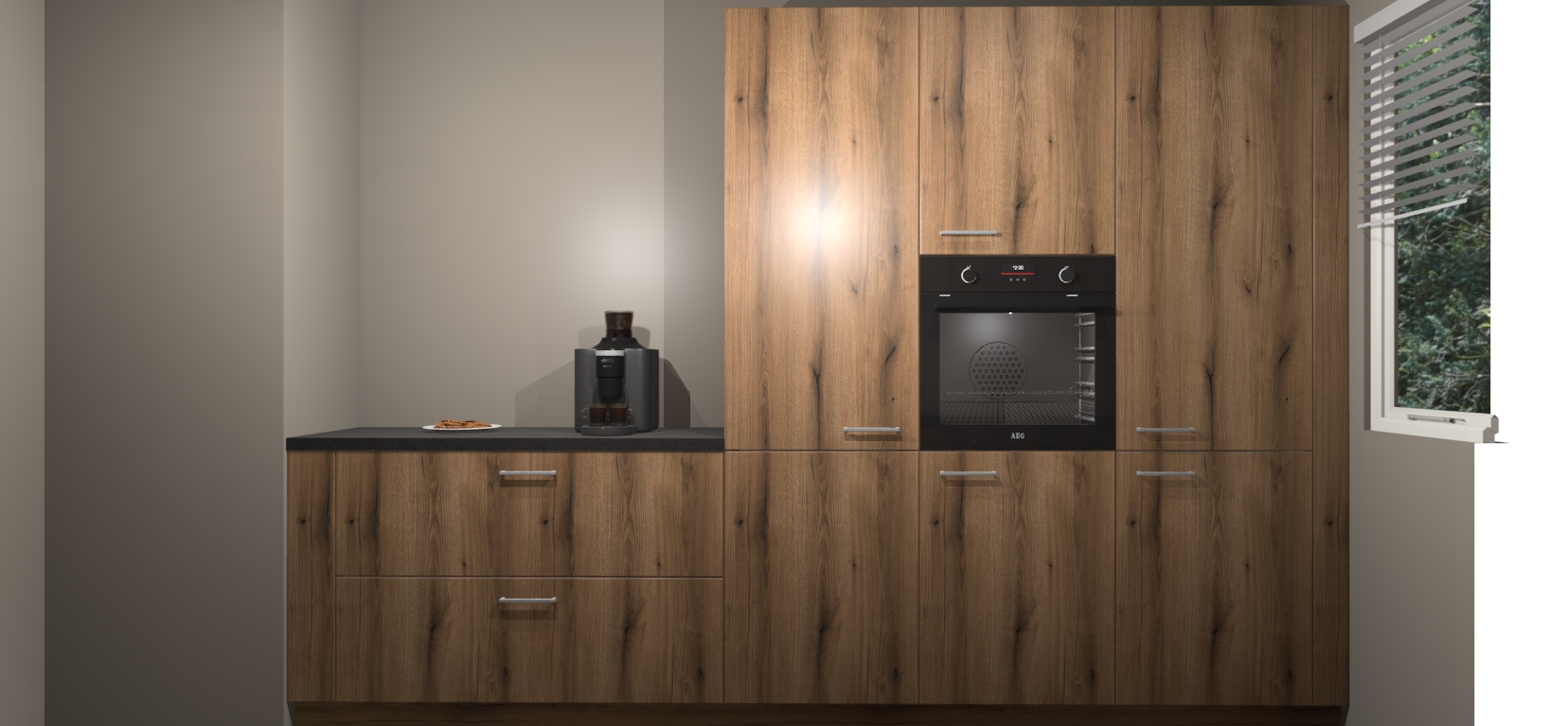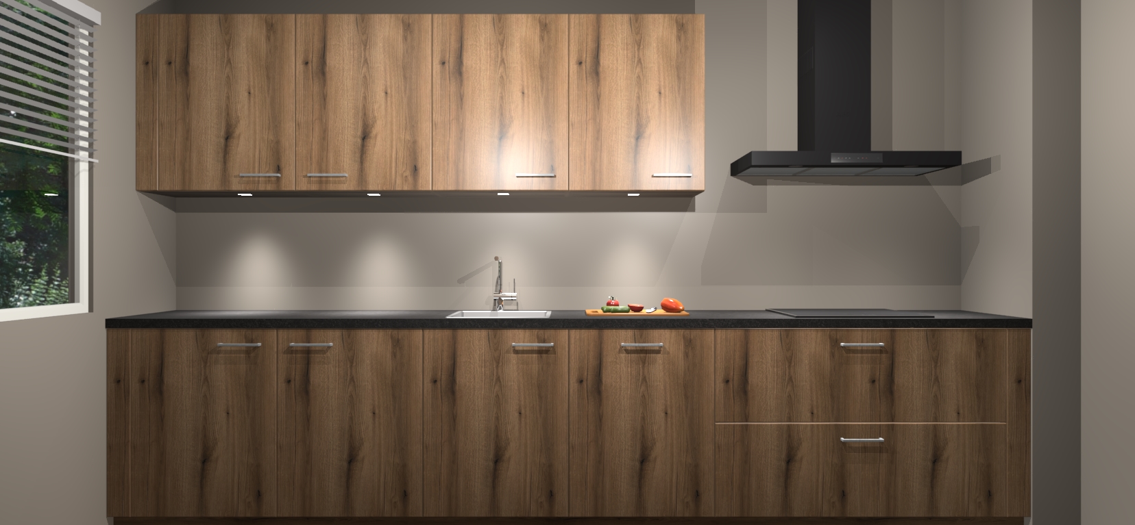 Een stijlvolle en praktische keuken als deze mag gezien worden. Dankzij de prachtige Goud Eiken matte afwerking wordt de keuken gemakkelijk het middelpunt van uw huis - hij ziet er geweldig uit onder allerlei lichtomstandigheden, van dag tot nacht!
