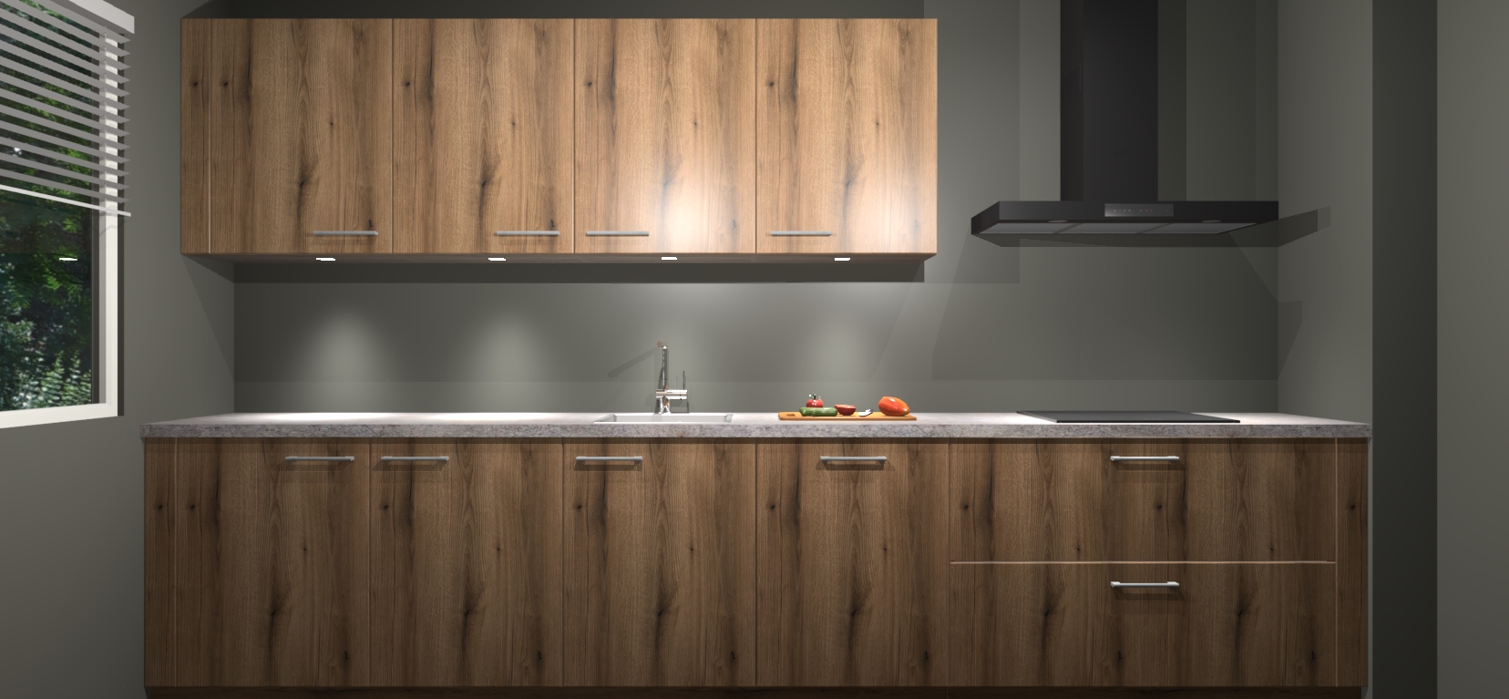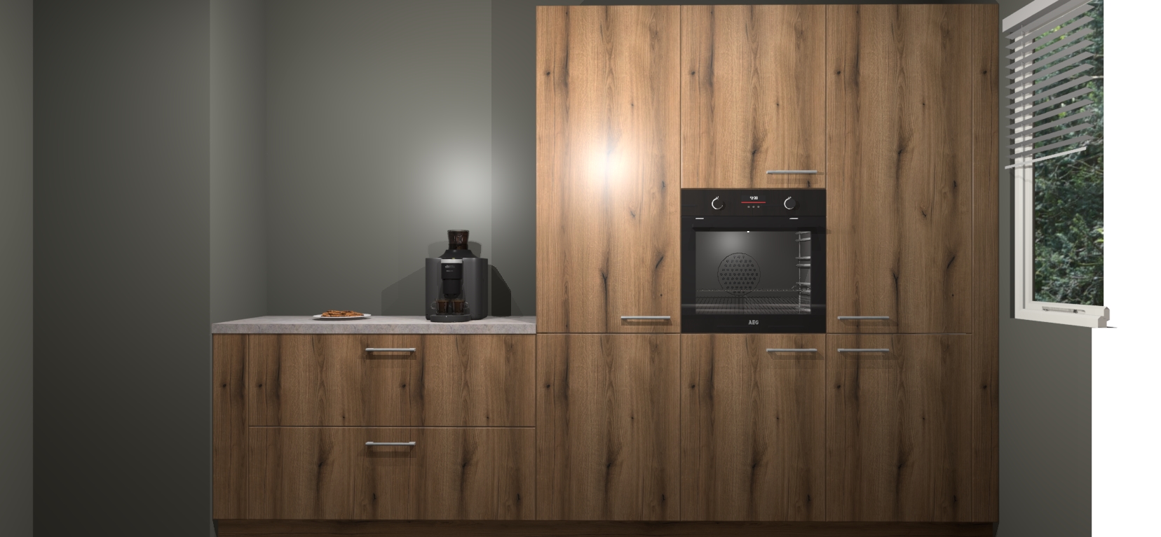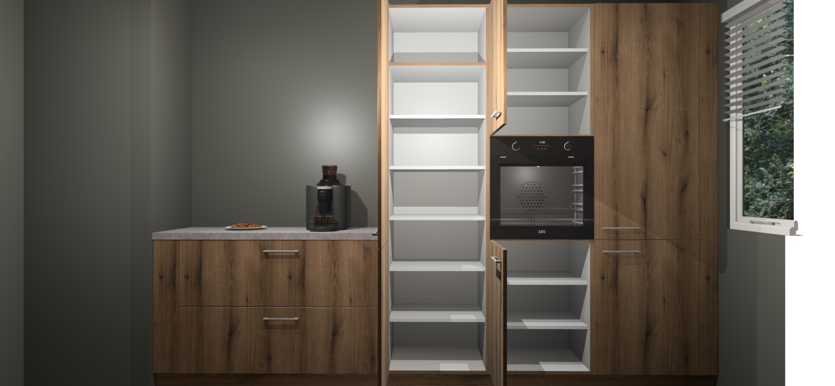 Een stijlvolle en praktische keuken als deze mag gezien worden. Dankzij de prachtige Goud Eiken matte afwerking wordt de keuken gemakkelijk het middelpunt van uw huis - hij ziet er geweldig uit onder allerlei lichtomstandigheden, van dag tot nacht!
