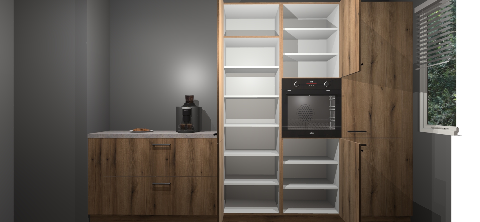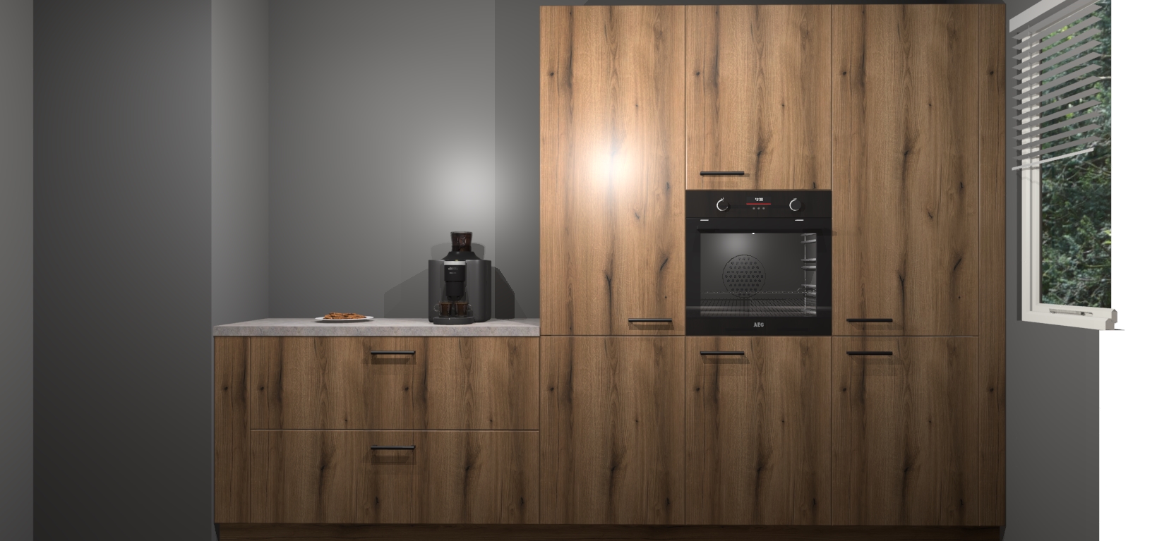 Een stijlvolle en praktische keuken als deze mag gezien worden. Dankzij de prachtige Goud Eiken matte afwerking wordt de keuken gemakkelijk het middelpunt van uw huis - hij ziet er geweldig uit onder allerlei lichtomstandigheden, van dag tot nacht!