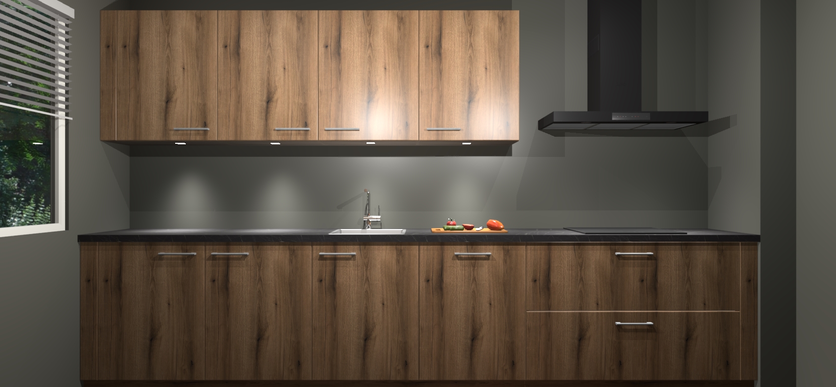 Een stijlvolle en praktische keuken als deze mag gezien worden. Dankzij de prachtige Goud Eiken matte afwerking wordt de keuken gemakkelijk het middelpunt van uw huis - hij ziet er geweldig uit onder allerlei lichtomstandigheden, van dag tot nacht!