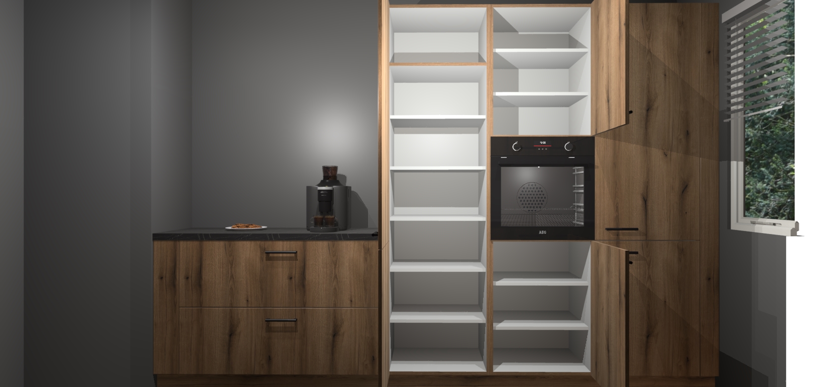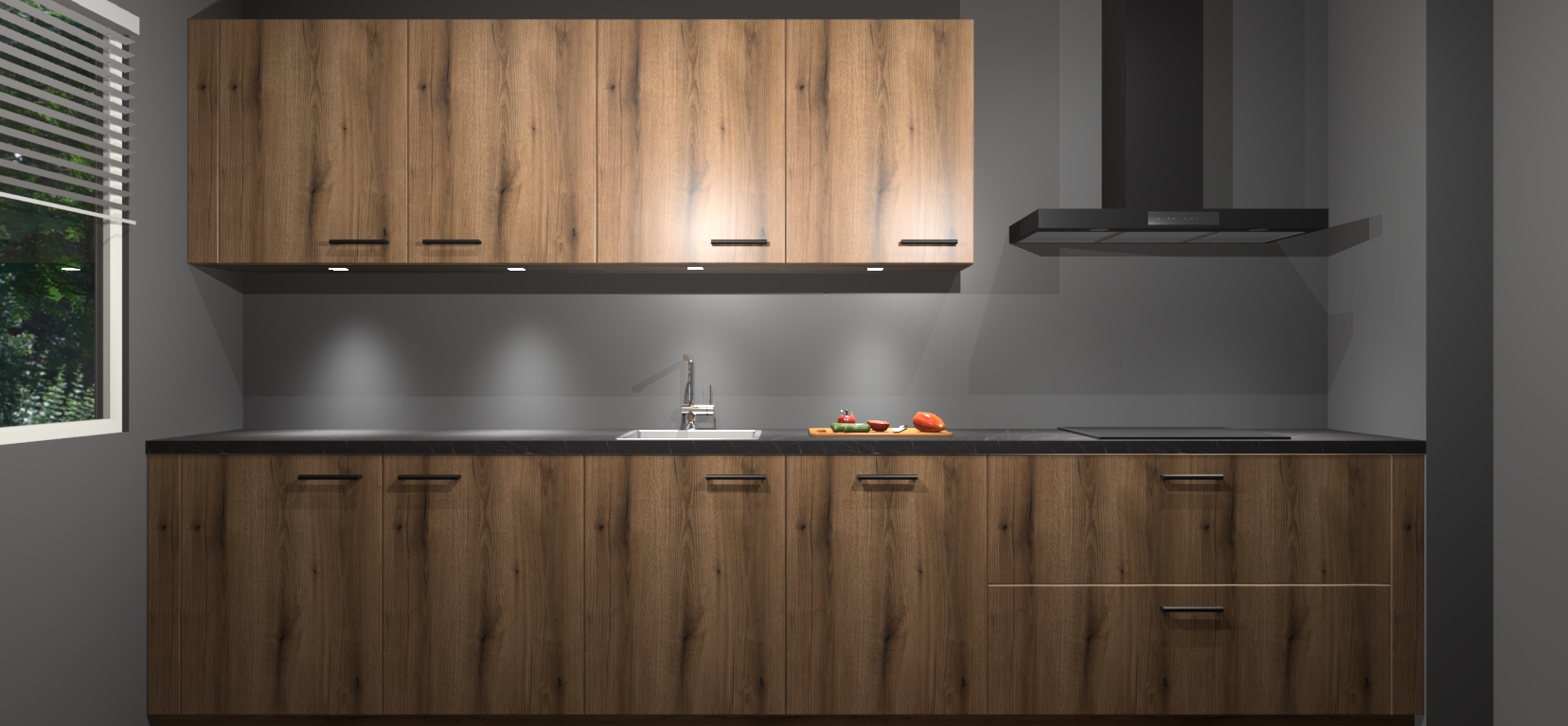 Een stijlvolle en praktische keuken als deze mag gezien worden. Dankzij de prachtige Goud Eiken matte afwerking wordt de keuken gemakkelijk het middelpunt van uw huis - hij ziet er geweldig uit onder allerlei lichtomstandigheden, van dag tot nacht!