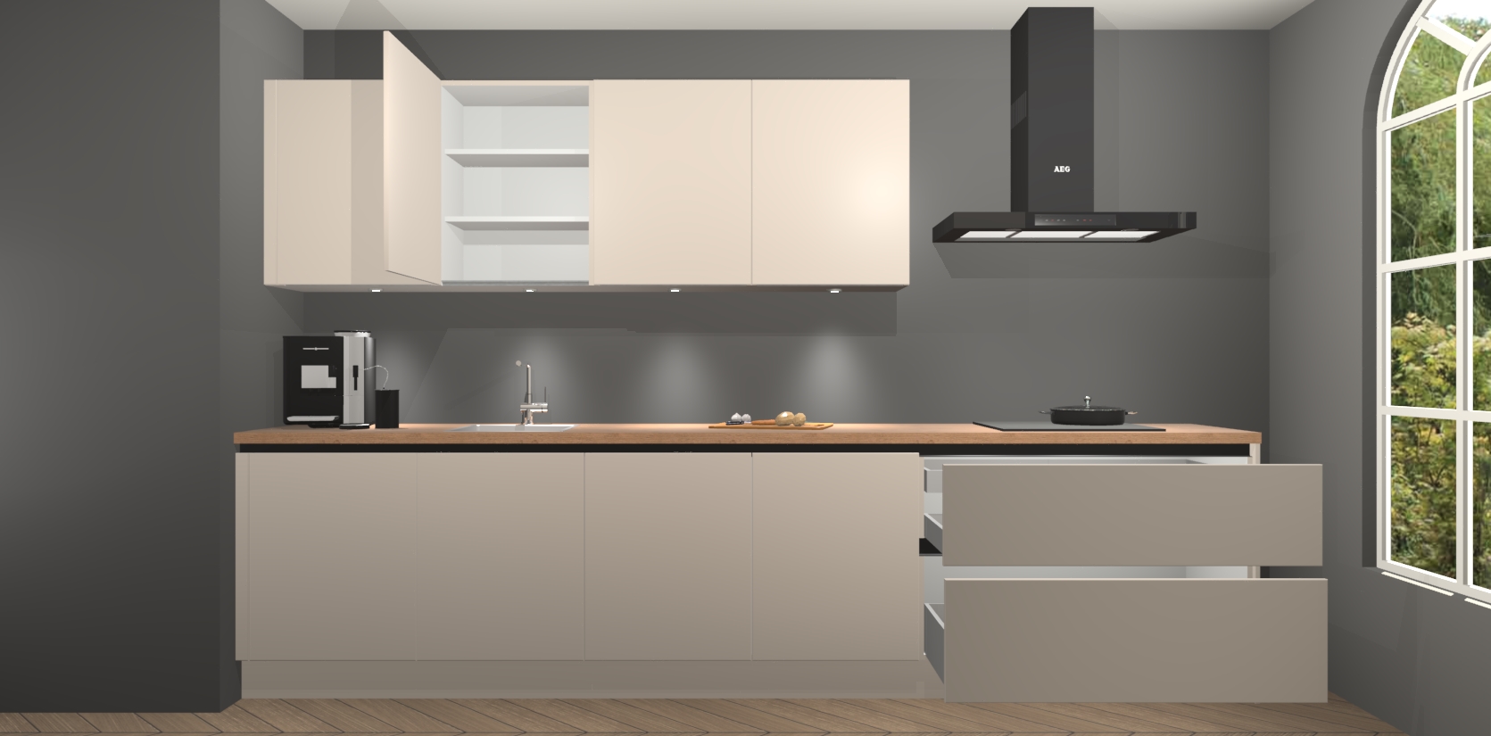 De softclose deuren openen en sluiten is ook heel eenvoudig - geniet van een moeiteloze keukenervaring, zelfs als er kinderen rondlopen. Voor extra gemak bij het plaatsen van uw bestelling bieden we ook een upgrade naar een kookplaat met geïntegreerde afzuiging.