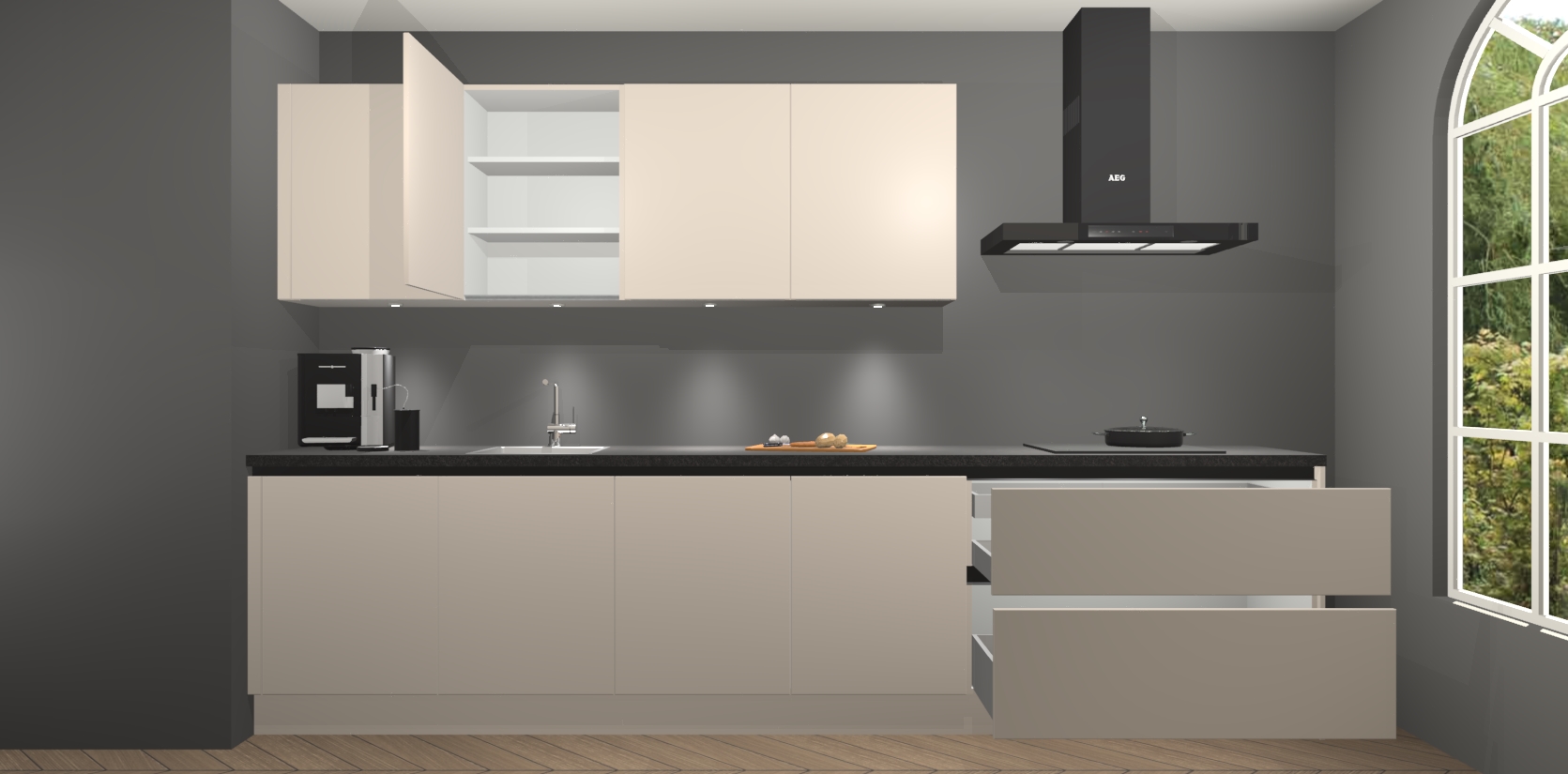 De softclose deuren openen en sluiten is ook heel eenvoudig - geniet van een moeiteloze keukenervaring, zelfs als er kinderen rondlopen. Voor extra gemak bij het plaatsen van uw bestelling bieden we ook een upgrade naar een kookplaat met geïntegreerde afzuiging.