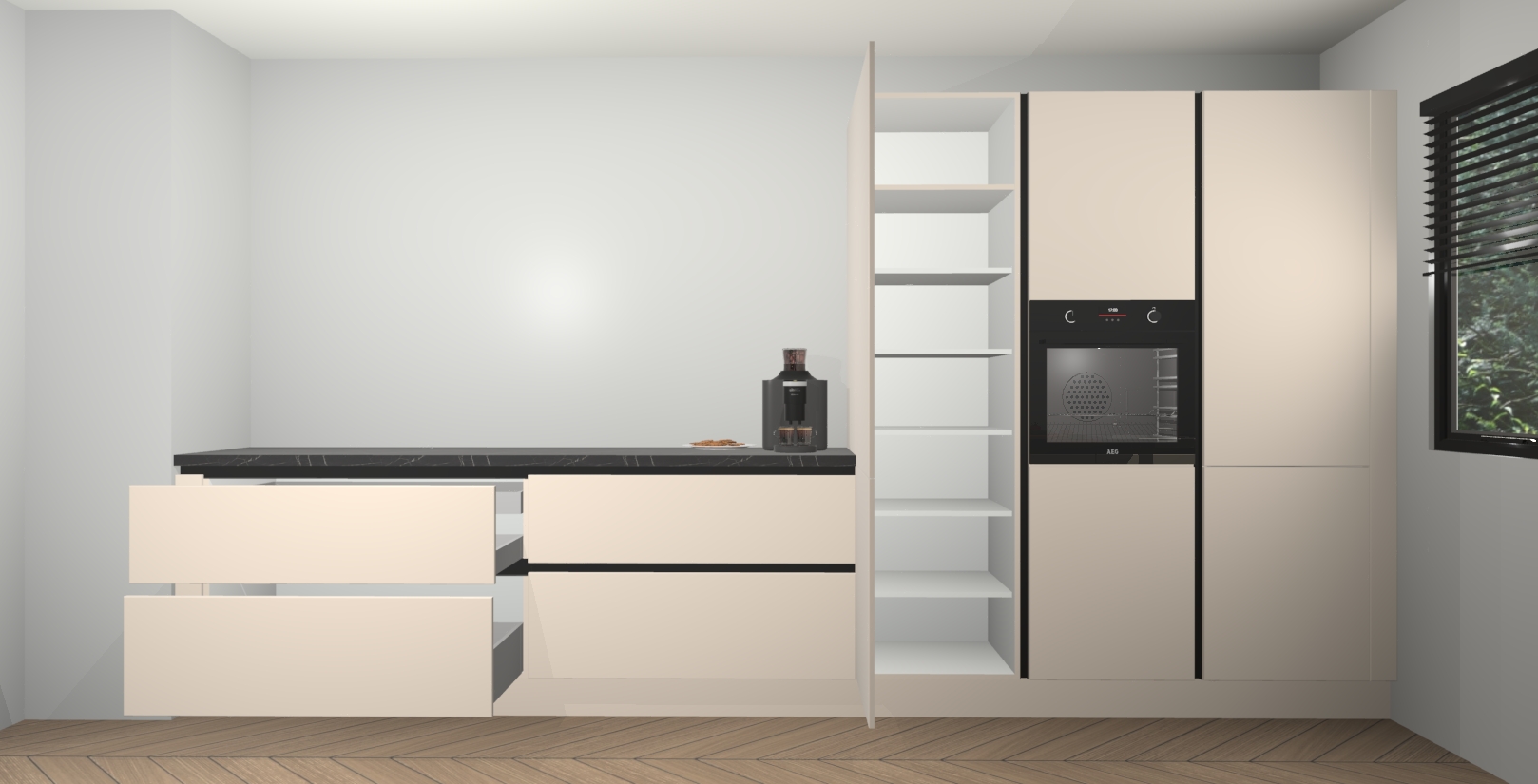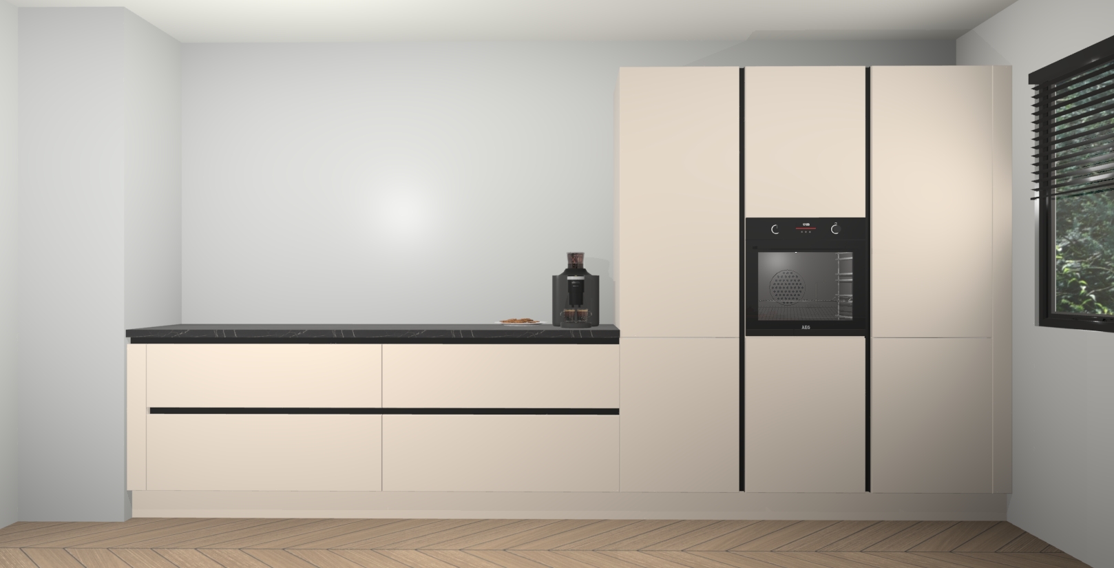 Een stijlvolle en praktische keuken als deze mag gezien worden. Dankzij de prachtige kasjmier matte afwerking wordt de keuken gemakkelijk het middelpunt van uw huis - hij ziet er geweldig uit onder allerlei lichtomstandigheden, van dag tot nacht!