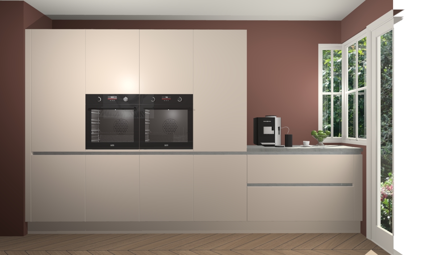 Een stijlvolle en praktische keuken als deze mag gezien worden. Dankzij de prachtige kasjmier matte afwerking wordt de keuken gemakkelijk het middelpunt van uw huis - hij ziet er geweldig uit onder allerlei lichtomstandigheden, van dag tot nacht!