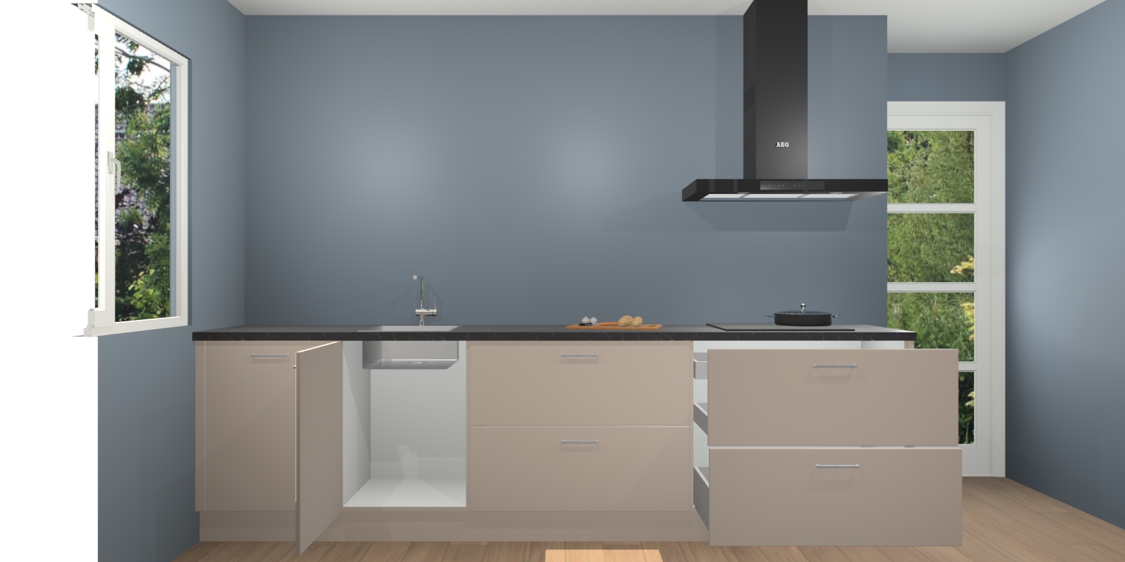 De softclose deuren openen en sluiten is ook heel eenvoudig - geniet van een moeiteloze keukenervaring, zelfs als er kinderen rondlopen. Voor extra gemak bij het plaatsen van uw bestelling bieden we ook een upgrade naar een kookplaat met geïntegreerde afzuiging.
