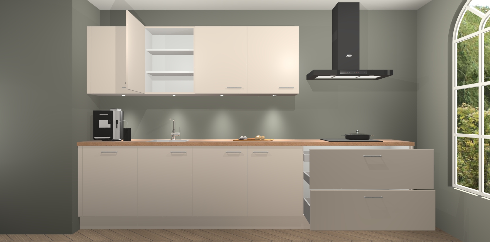 De softclose deuren openen en sluiten is ook heel eenvoudig - geniet van een moeiteloze keukenervaring, zelfs als er kinderen rondlopen. Voor extra gemak bij het plaatsen van uw bestelling bieden we ook een upgrade naar een kookplaat met geïntegreerde afzuiging.
