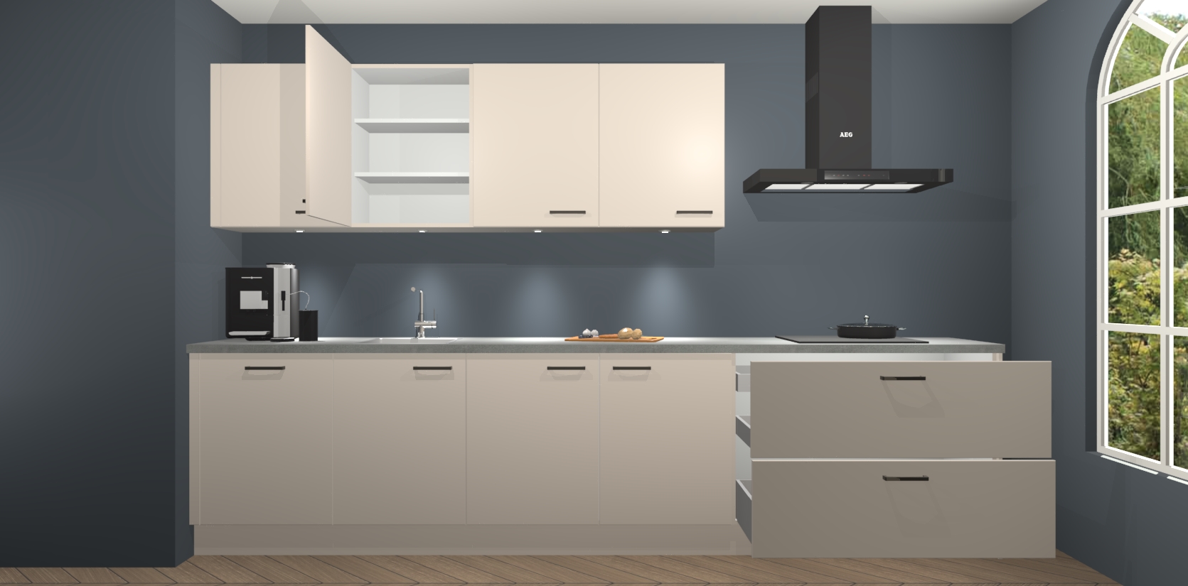 De softclose deuren openen en sluiten is ook heel eenvoudig - geniet van een moeiteloze keukenervaring, zelfs als er kinderen rondlopen. Voor extra gemak bij het plaatsen van uw bestelling bieden we ook een upgrade naar een kookplaat met geïntegreerde afzuiging.