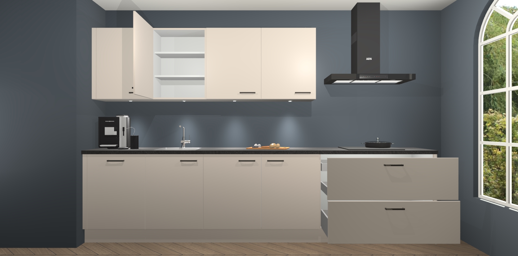 De softclose deuren openen en sluiten is ook heel eenvoudig - geniet van een moeiteloze keukenervaring, zelfs als er kinderen rondlopen. Voor extra gemak bij het plaatsen van uw bestelling bieden we ook een upgrade naar een kookplaat met geïntegreerde afzuiging.