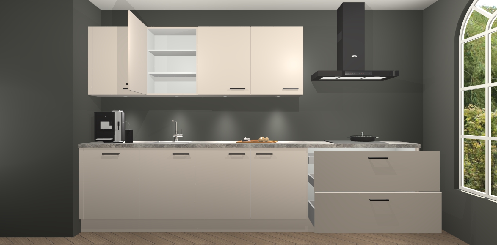 De softclose deuren openen en sluiten is ook heel eenvoudig - geniet van een moeiteloze keukenervaring, zelfs als er kinderen rondlopen. Voor extra gemak bij het plaatsen van uw bestelling bieden we ook een upgrade naar een kookplaat met geïntegreerde afzuiging.