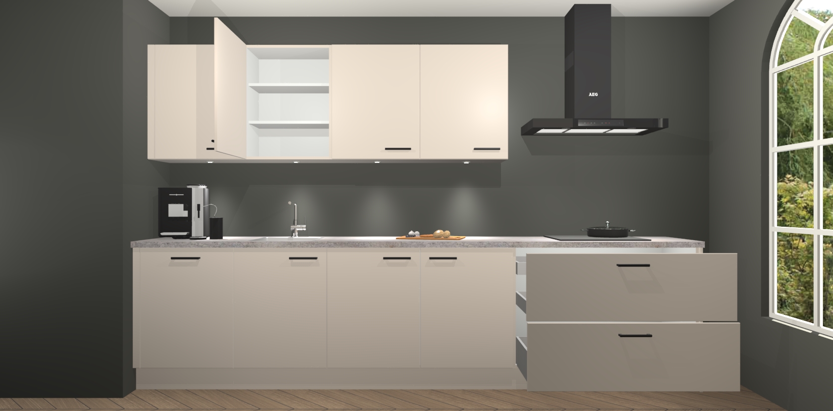 De softclose deuren openen en sluiten is ook heel eenvoudig - geniet van een moeiteloze keukenervaring, zelfs als er kinderen rondlopen. Voor extra gemak bij het plaatsen van uw bestelling bieden we ook een upgrade naar een kookplaat met geïntegreerde afzuiging.