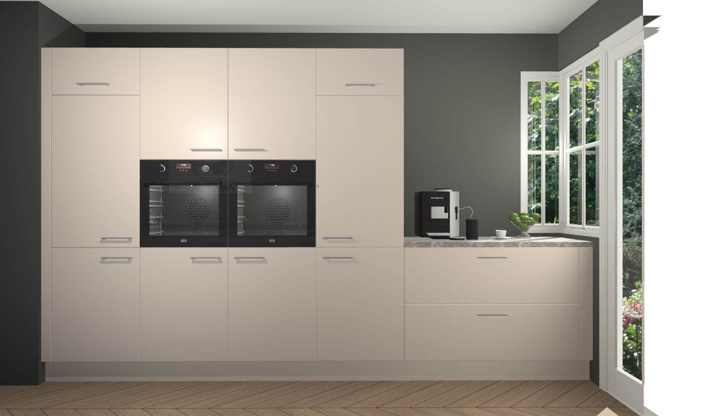 Een stijlvolle en praktische keuken als deze mag gezien worden. Dankzij de prachtige kasjmier matte afwerking wordt de keuken gemakkelijk het middelpunt van uw huis - hij ziet er geweldig uit onder allerlei lichtomstandigheden, van dag tot nacht!