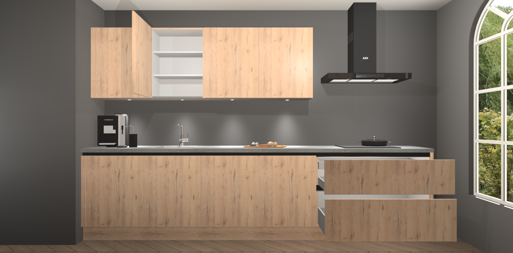 De softclose deuren openen en sluiten is ook heel eenvoudig - geniet van een moeiteloze keukenervaring, zelfs als er kinderen rondlopen. Voor extra gemak bij het plaatsen van uw bestelling bieden we ook een upgrade naar een kookplaat met geïntegreerde afzuiging.