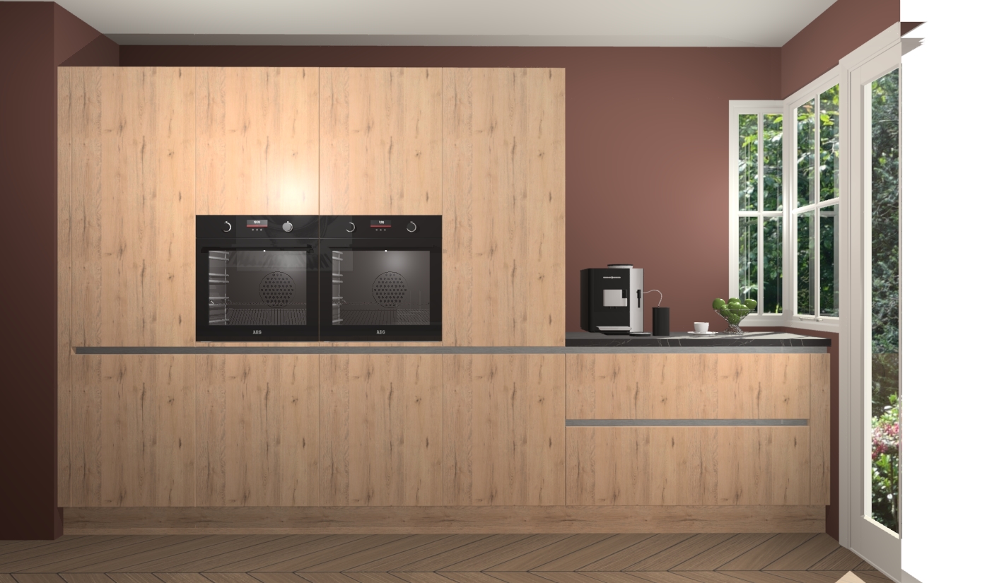 Een stijlvolle en praktische keuken als deze mag gezien worden. Dankzij de prachtige madera natuur matte afwerking wordt de keuken gemakkelijk het middelpunt van uw huis - hij ziet er geweldig uit onder allerlei lichtomstandigheden, van dag tot nacht!