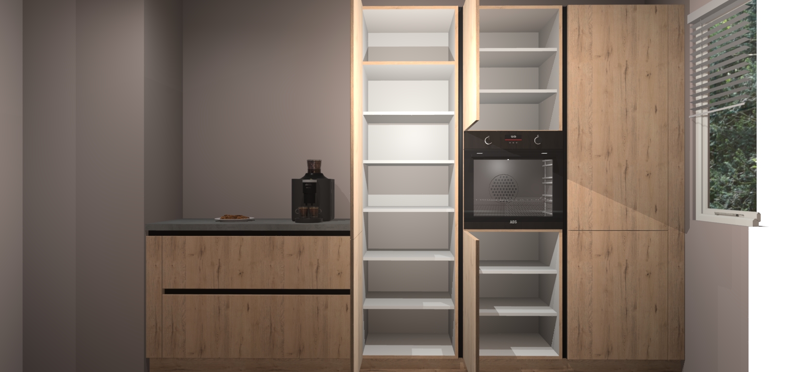Een stijlvolle en praktische keuken als deze mag gezien worden. Dankzij de prachtige Madera Natuur matte afwerking wordt de keuken gemakkelijk het middelpunt van uw huis - hij ziet er geweldig uit onder allerlei lichtomstandigheden, van dag tot nacht!