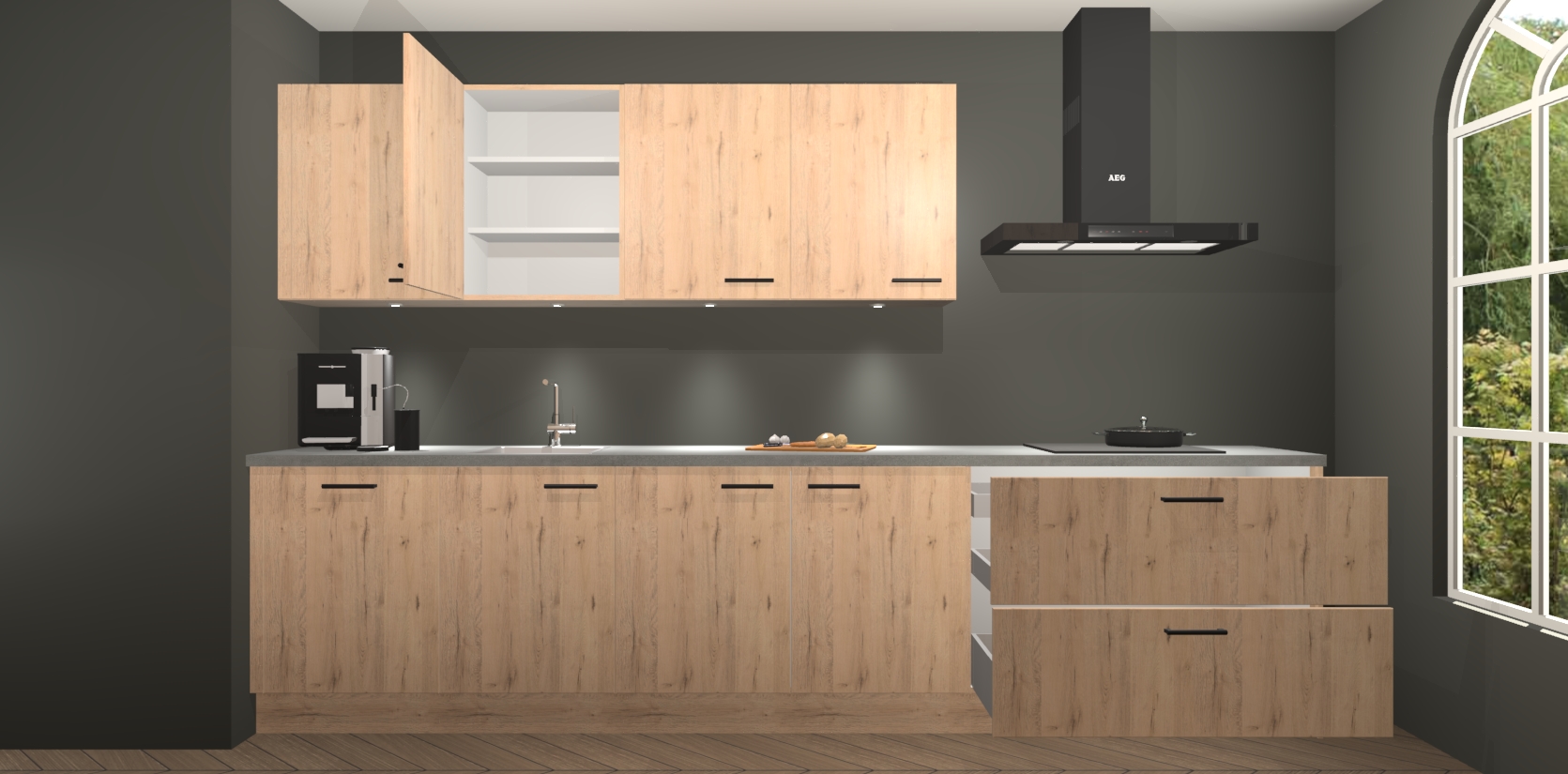 De softclose deuren openen en sluiten is ook heel eenvoudig - geniet van een moeiteloze keukenervaring, zelfs als er kinderen rondlopen. Voor extra gemak bij het plaatsen van uw bestelling bieden we ook een upgrade naar een kookplaat met geïntegreerde afzuiging.